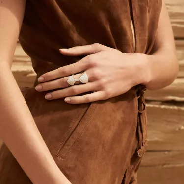 Indem sie mit ihren Proportionen spielt, verwandelt Akillis den Python. Er wird zu einem geschwungenen und umhüllenden Rüstungsring, der beruhigt und schützt und dabei an die antiken Krieger erinnert, die für die Etymologie des Juweliers wichtig sind. Die französische Marke hat darauf geachtet, die Haut des Pythons in Gold hervorzuheben und dabei ihre Prägetechniken einzusetzen.