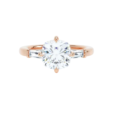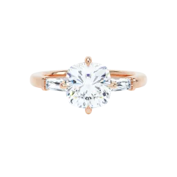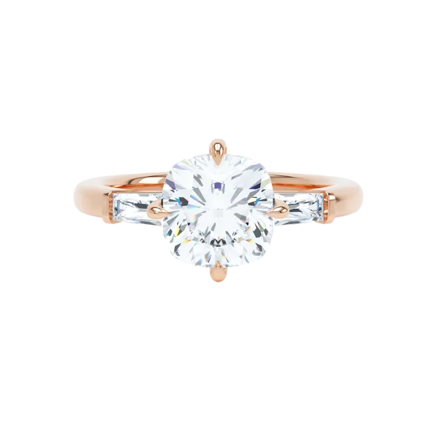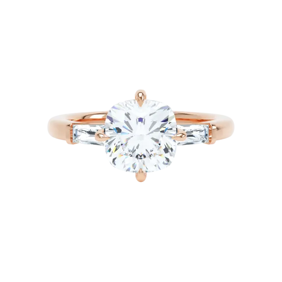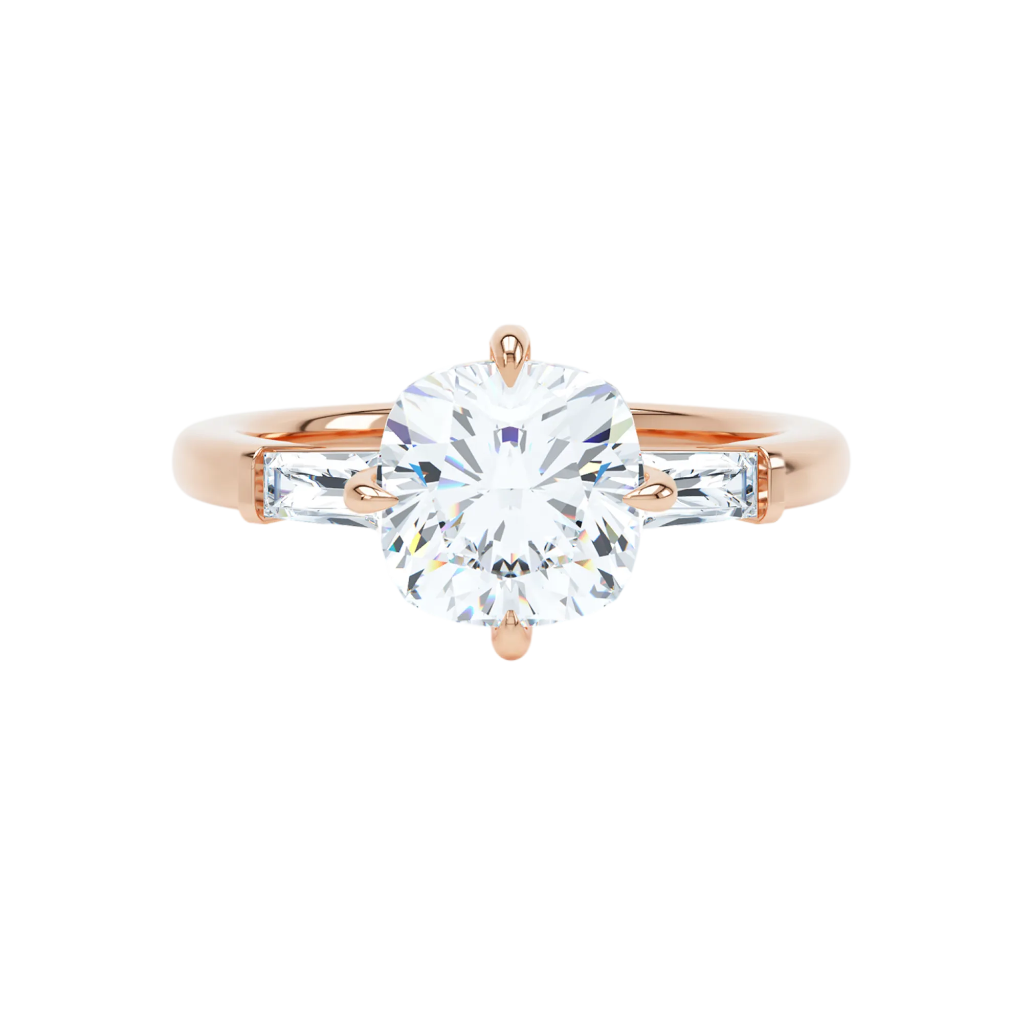 Eine schicke und zeitlose Kombination: der LOEV-Drei-Stein-Ring. Ein Diamant im Cushion-Schliff in der Mitte, flankiert von spitz zulaufenden Baguette-Diamanten. Der Ring ist mit einem 2,00ct Cushion und Baguettes mit einem Gesamtgewicht von 0,34 ct in 18Kt recyceltem Gold gefasst.