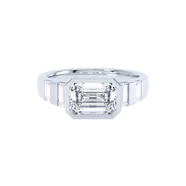 Der gestreifte LOEV-Diamantring ist handgefertigt mit einem Smaragd im Stufenschliff, der in Ost-West-Richtung gefasst ist und von gestreiften Diamanten im Baguetteschliff flankiert wird.