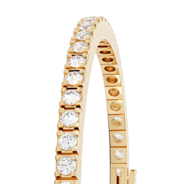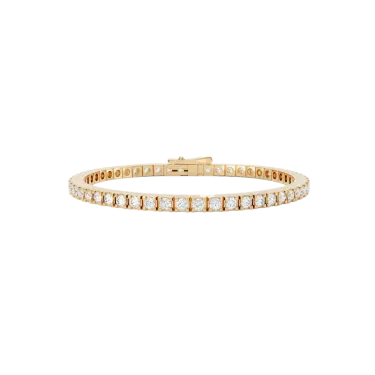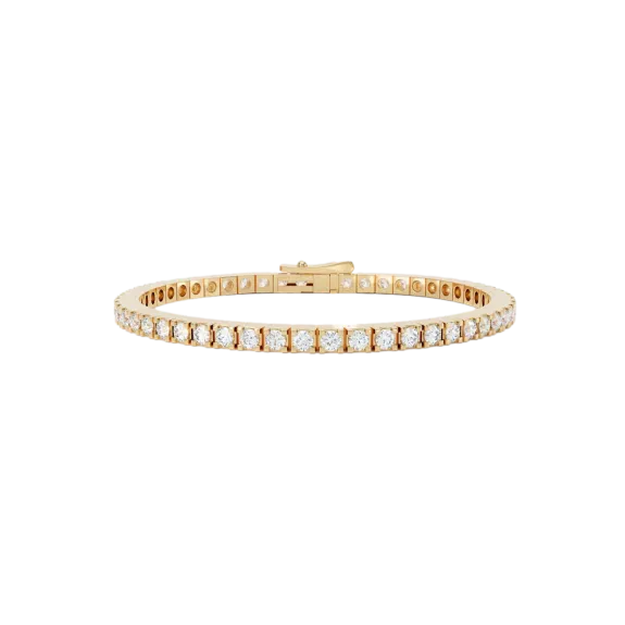 Unsere zeitgemäße Interpretation dieses klassischen Designs zeichnet sich durch moderne, kastenförmige Zacken und eine elegante, polierte Goldfassung aus. Er enthält im Labor gezüchtete Diamanten der Farbe DEF und der Reinheit VS+, die mit erneuerbarer Energie erzeugt wurden. Die üppige Verwendung von Gold zieht die Blicke auf sich, fließt aber dennoch sanft am Handgelenk entlang und macht sie zum perfekten Begleiter für Tag und Nacht. Lasst uns spielen!