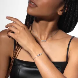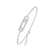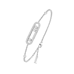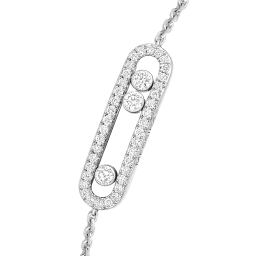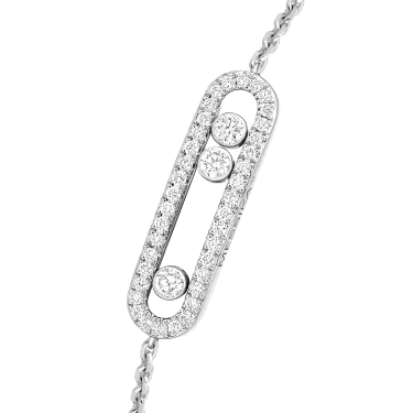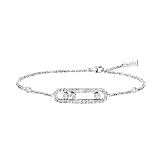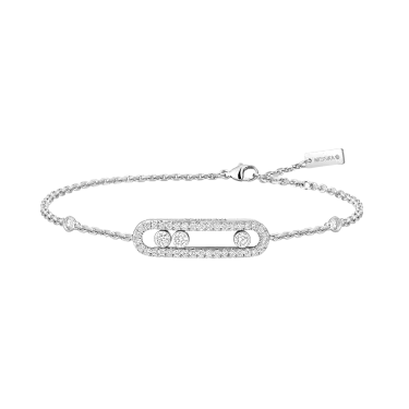 Dieses vollständig von Hand gefertigte Pavé-Armband aus 18 Karat Weißgold ist Teil der legendären Move-Kollektion des Hauses Messika. Mit seinen drei beweglichen Diamanten von jeweils 0,08 Karat, die in ihrem kostbaren Pavé-Käfig funkeln und sich mit jeder Bewegung bewegen, eignet sich dieses Baby Move-Armband für schmale Handgelenke. Das schlichte Design und die zarte Kette machen dieses Diamantarmband zum idealen Begleiter für den Alltag der Frau, zum Talisman, der die Liebe von gestern, heute und morgen symbolisiert. Der Glanz des Weißgolds unterstreicht die Reinheit der Diamanten und betont so ihren wunderschönen Glanz. Ein kostbares Detail: Die Diamanten, die die Kette zieren, verleihen diesem Schmuckstück zusätzlichen Glanz.