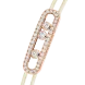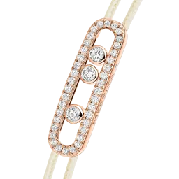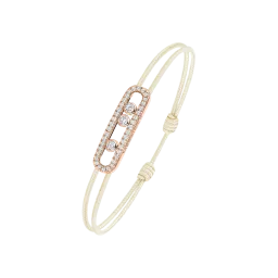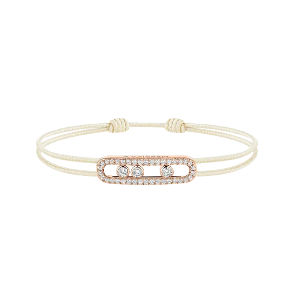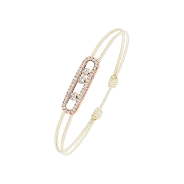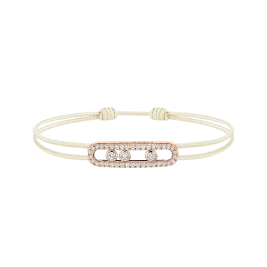 Das ikonische Baby Move-Motiv mit seinen drei beweglichen Diamanten präsentiert sich hier neu als lässig-schickes Diamantarmband. Eine originelle Kombination aus Roségold, Diamanten und einer cremefarbenen Kordel für ein Schmuckstück aus Gold und Diamanten, das das Handgelenk strahlend schmückt. Dieses Diamant-Kordelarmband MESSIKA CARE(s) ist ein stilvoller Begleiter für den Alltag und lässt sich dank seiner Schiebeverschlüsse im Handumdrehen anpassen. Dieses doppelt wertvolle Schmuckstück vermittelt eine Botschaft der Solidarität und des Engagements. Für jedes verkaufte Stück aus der Kollektion MESSIKA CARE(s) wird ein Teil des Gewinns über die Fondation Valérie Messika an Vereine und NGOs gespendet, die sich für Kinder im Bereich Bildung und Gesundheit einsetzen. Ein schöner Butterfly-Effekt, der Grenzen überschreitet.