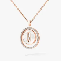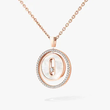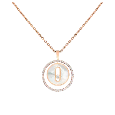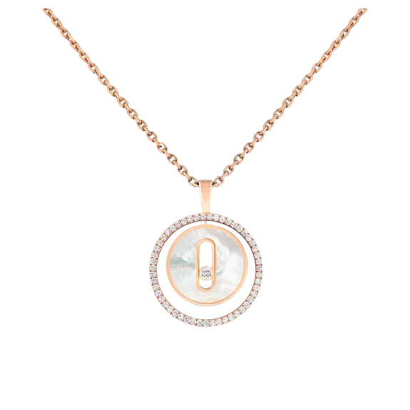 Lassen Sie sich von der Halskette Lucky Move aus Roségold, Diamanten und weißem Perlmutt verführen. Die Kollektion Lucky Move Jewelry ist von Talisman-Schmuckstücken inspiriert und verfügt nun über Ziersteine, die für einen farbenfrohen Touch sorgen, der so einzigartig ist wie Ihre Persönlichkeit. Das weiße Perlmutt, das auf natürliche Weise in bestimmten Muscheln vorkommt, besticht durch seine subtilen schillernden Reflexe. Eine Rille in der Mitte hält einen Diamanten fest, der die Freiheit symbolisiert. Das Medaillon dreht sich um sich selbst und wird durch einen Lichtkreis akzentuiert, der von einer Vielzahl von Diamanten unterbrochen wird. Funkelnde Reflexionen, Strahlen und Bewegung schaffen ein zeitlos modernes Luxusschmuckstück. Zum Tragen in völliger Freiheit!