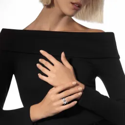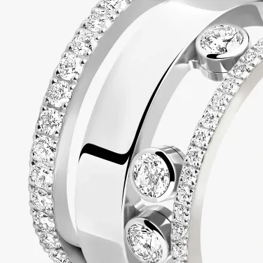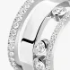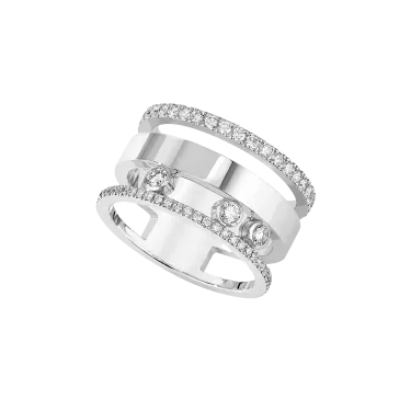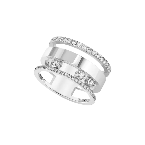 In dieser neuen Version des Romane-Rings sammelt Messika nicht mehr nur zwei, sondern drei Ringe. Drei Stile, drei Grafiken, die sich gegenseitig herausfordern und sich im selben luftigen Geist antworten. Mein erster Ring ist der unverzichtbare, komplett gefasste Mikro-Ring, der dem Trend zu ultradünnen Ringen folgt. Mein zweiter Ring ist ein schlichter, flacher Ring aus 18-karätigem Weißgold, der voll im Trend liegt. Mein dritter Ring ist der zeitlose und strahlende Diamantring. Das Verbindungsstück zwischen diesen drei Ringen sind drei Diamanten, das Markenzeichen der Move-Kollektion. Voll und leer spielen das Spiel der Akkumulation, ohne dass sich die Ringe addieren. Nie zuvor hat ein Ring unseren Wunsch nach mehreren Ringen so gut erfüllt.
