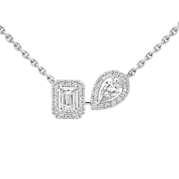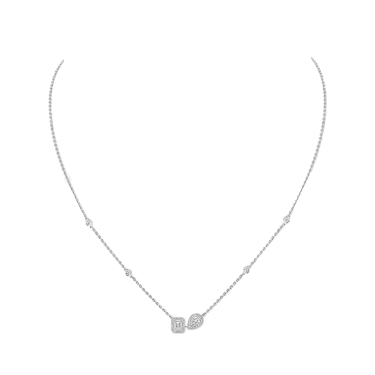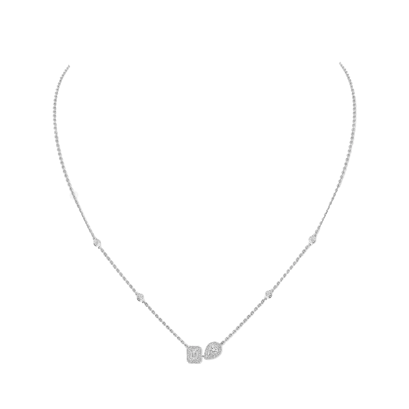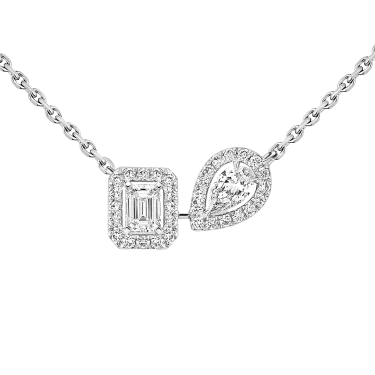My Twin zelebriert die Harmonie der Gegensätze: das Design des Diamanten im Smaragdschliff und die Sinnlichkeit des Diamanten im Tropfenschliff. Ein außergewöhnliches Duo, das durch diese Diamantkette aus Weißgold noch verstärkt wird. Das für das Haus charakteristische, subtil durchbrochene Pavé-Fassung verstärkt den Glanz der Steine in der Mitte. Die Neigung des tropfenförmigen Diamanten verleiht dem Schmuckstück einen modernen Akzent. Diese leicht zu tragende Diamantkette für Damen begleitet Sie in jedem Moment. Trauen Sie sich, sie mit anderen Luxusschmuckstücken des Hauses zu kombinieren, um einen noch selbstbewussteren Look zu erzielen.