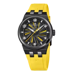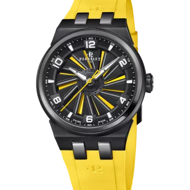 Der Perrelet Turbine Titanium 41 Yellow ist ein mutiges und stilvolles Statement-Stück, das sicher Blicke auf sich ziehen wird. Die Uhr ist aus leichtem und strapazierfähigem Titan mit einer schwarzen DLC-Beschichtung gefertigt, die kratzfest ist und im Laufe der Zeit nicht verblasst. Das ikonische Turbinen-Zifferblatt verfügt über ein leuchtend gelbes Zifferblatt, das zum Leben erwacht, wenn die Turbine rotiert. Das Armband aus Kautschuk ist ebenfalls gelb, was ein harmonisches und auffälliges Aussehen schafft.