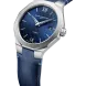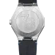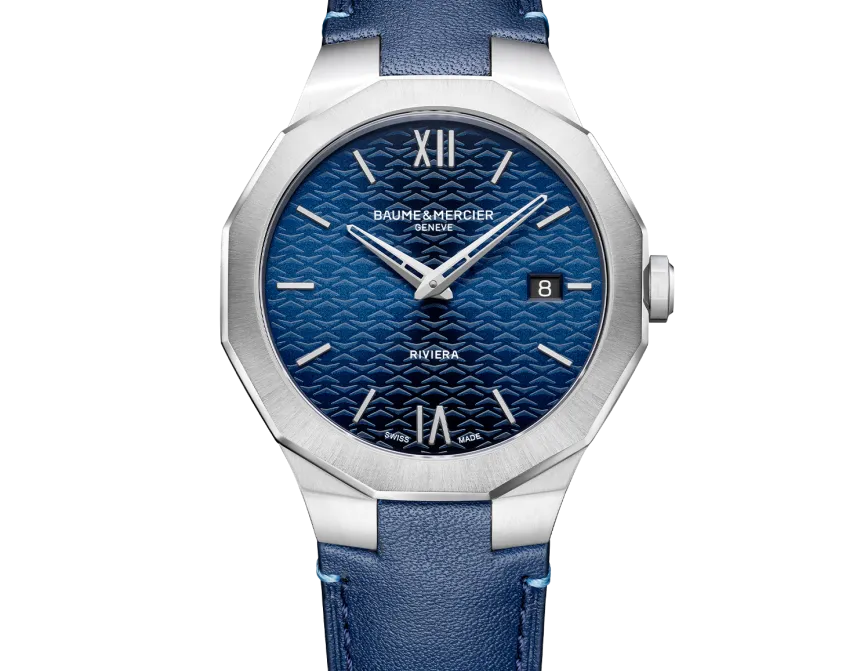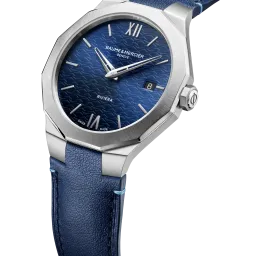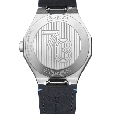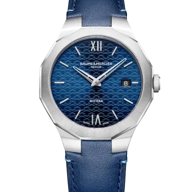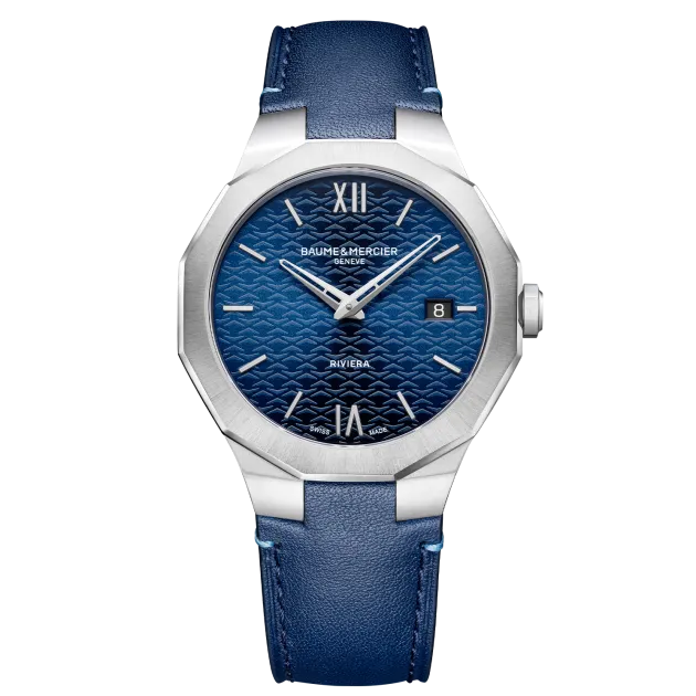 Die Riviera 10846 mit 39 mm Durchmesser besticht durch ihr schraubenloses, zwölfeckiges Gehäuse aus poliertem und satiniertem Edelstahl, das durch ein entspiegeltes Saphirglas geschützt ist. Das blaue Zifferblatt mit Sonnenschliff und Wellenmuster bringt die vernieteten, rhodinierten römischen Ziffern und Indizes besonders gut zur Geltung. Angetrieben von einem Quarzwerk (ETA F06.115) bietet sie eine Gangreserve von 5 Jahren und eine Wasserdichtigkeit von 5 ATM. Ihr austauschbares Armband aus dunkelblauem Kalbsleder ist mit einem zuverlässigen System ausgestattet, das einen werkzeuglosen Wechsel ermöglicht.