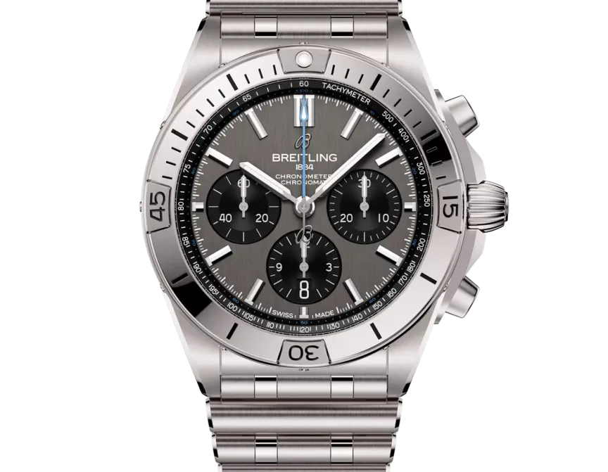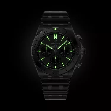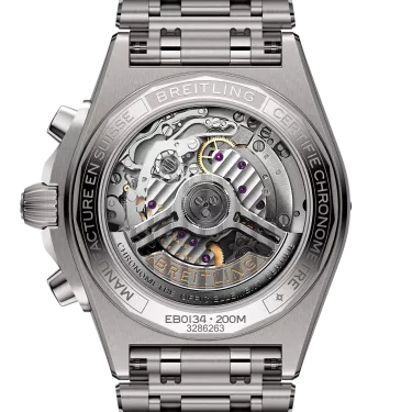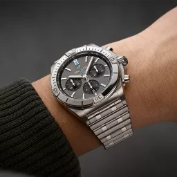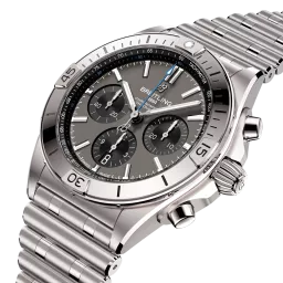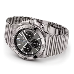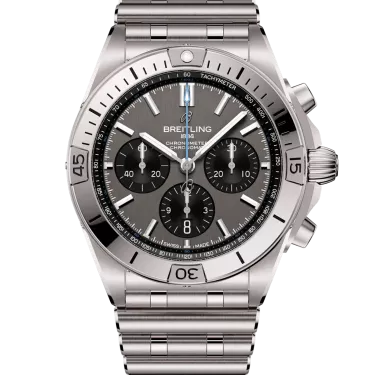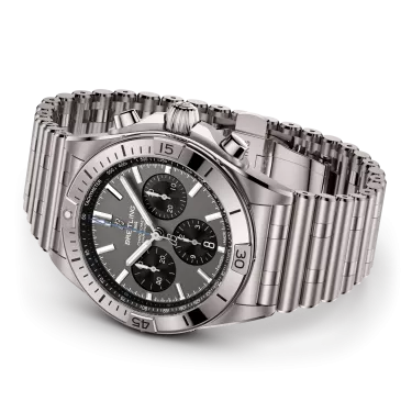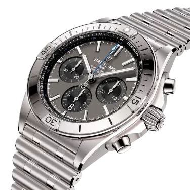 Breitling's Allzweck-Uhr für jede Art von Aktivität. Die Chronomat nimmt einen bedeutenden Platz in der Geschichte von Breitling ein. Bei ihrer Einführung 1984, als extraflache Quarzuhren an der Tagesordnung waren, wagte Breitling den Schritt zu einer mechanischen Uhr mit beeindruckenden Proportionen. Die Chronomat basiert auf der Uhr Frecce Tricolori, die 1983 in Zusammenarbeit mit der berühmten italienischen Fliegerstaffel entwickelt und lanciert worden war. Sie feierte das hundertjährige Bestehen von Breitling mit Stil und gab dem mechanischen Chronographen den ihm gebührenden Platz bei der Marke zurück, die ihren Weltruf mit diesen unglaublichen Uhren begründet hatte. Der Chronomat ist in verschiedenen Materialien erhältlich, darunter Edelstahl, 18-karätiges Rotgold und Titan, und verfügt über ein 42-mm-Gehäuse und die unverkennbare Lünette mit ihren vier Reitern bei den 15-Minuten-Marken. Der Chronomat ist mit einer Reihe von farbigen Zifferblättern erhältlich und wird mit dem charakteristischen Rouleaux-Armband aus Metall oder Kautschuk kombiniert. Getreu dem Original wird der Chronomat vom hauseigenen Breitling Manufakturkaliber 01 angetrieben, einem COSC-zertifizierten Chronometer.