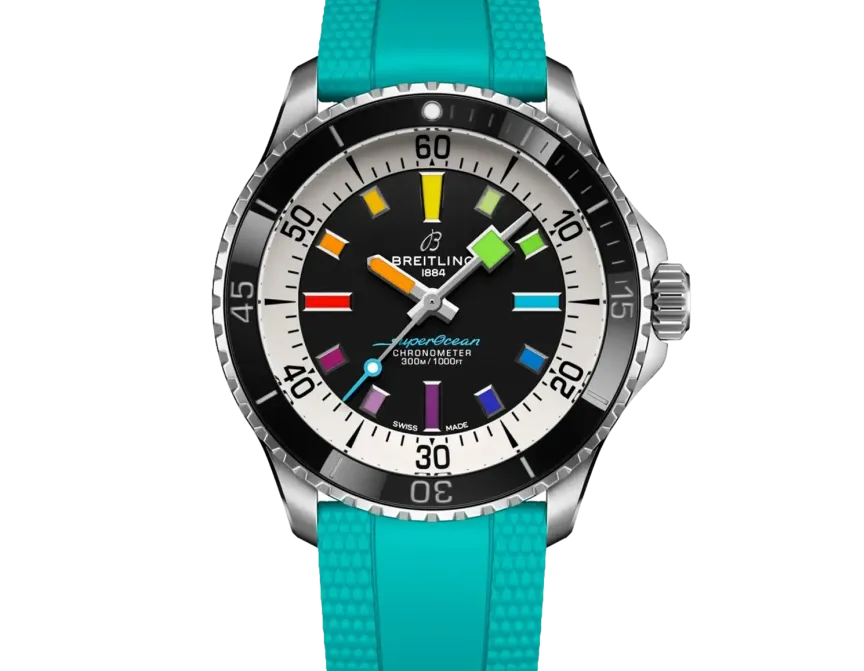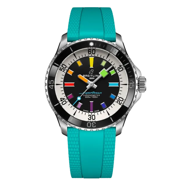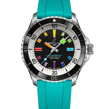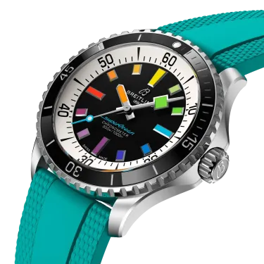 Leistung und Stil für alle Ihre Wassersport-Aktivitäten. In den 1960er-Jahren galt der Tauchsport als der letzte Schrei. Für Taucher war Timing alles, und Breitling machte sich daran, eine möglichst schnörkellose Taucheruhr zu entwickeln, bei der auf jede Funktion verzichtet wurde, die nicht auf die lebensrettenden Anforderungen unter Wasser abgestimmt war. Diese auf das Wesentliche reduzierte Uhr erhielt den Namen Superocean Slow Motion. Was blieb, waren klare Linien, massive Leuchtindizes, eckige Zeiger und ein kontrastreicher Zifferblattring, um maximale Ablesbarkeit zu garantieren. Praktisch war sie in jedem Fall. Aber was die Leute wirklich begeisterte, war ihr Look. Die neue Superocean nimmt die gefeierten Designelemente der Slow Motion wieder auf und ergänzt sie mit modernen Funktionen wie einer kratzfesten Keramikinlay-Lünette und Zifferblättern in leuchtenden Farben. Breite Zeiger und Indizes in lumineszierenden Super-LumiNova® Regenbogenfarben sorgen für eine gute Ablesbarkeit (und zusätzlichen Spass) unter Wasser. Die Uhr ist wasserdicht bis 300 Meter (1000 Fuss), stossfest sowie sand- und salzwasserbeständig. Bei der Ausführung in Bronze kommt eine spezielle Legierung zum Einsatz, die eine hervorragende Korrosionsbeständigkeit aufweist, aber mit der Zeit eine dezente Patina entwickelt, durch die die Uhr noch einzigartiger wird. Das Kautschukarmband ist mit einer Faltschliesse versehen, die präzise Einstellungen von bis zu 15 mm ermöglicht und für optimale Passgenauigkeit beim Tragen über Rashguards und Taucheranzügen sorgt. Zur Sicherheit ist die Lünette nur in eine Richtung drehbar. Und das Beste ist: Streng genommen ist sie keine reine Taucheruhr mehr. Surfen, Schwimmen, Drinks an der Strandbar – alles ist möglich. Die Superocean ist die perfekte Balance zwischen nostalgischem Vermächtnis und einem frischen, neuen Look.