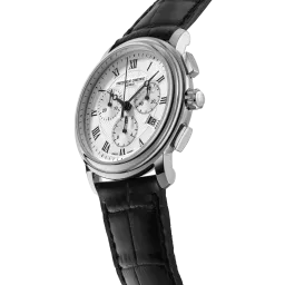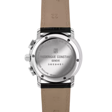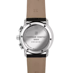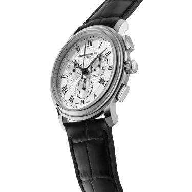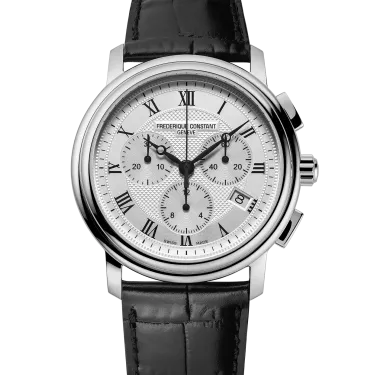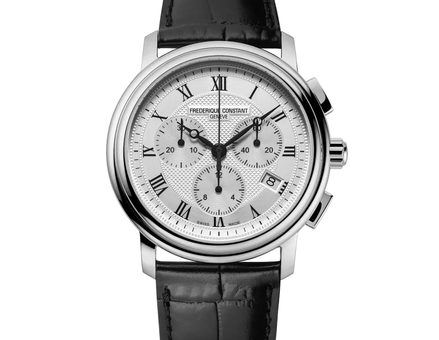 Frederique Constant Classics Quarz 40 mm; Quarzwerk FC-292; 13 Lagersteine, 54 Monate Batterielebensdauer, mit Stunden, Minuten, Sekunden, Chronograph , Datum; Edelstahlgehäuse, gewölbtes Saphir und 2-O-Ring-Krone, Höhe 10,2 mm; wasserdicht bis 6 ATM; silbernes Zifferblatt, guillochiertes Dekor, gedruckte römische Indexe und Lederband.