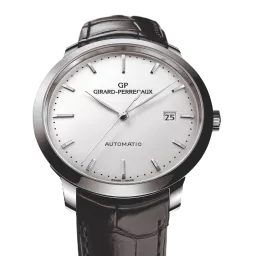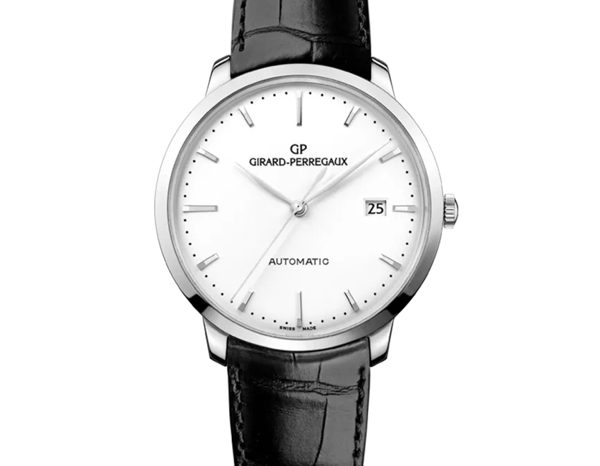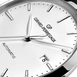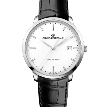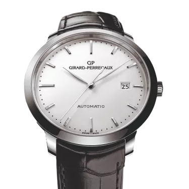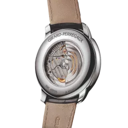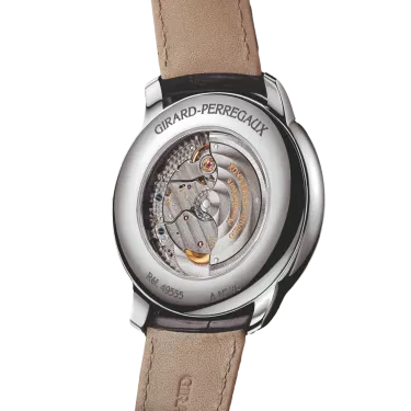 Ein Modell, das dem Designgeist der Uhren der 1960er Jahre folgt und eine Hommage an die technischen Fortschritte von Girard-Perregaux auf dem Gebiet der Zeitmessung darstellt, gekrönt durch den Preis zum hundertjährigen Bestehen des Neuenburger Observatoriums. Ein klassischer Zeitmesser in Bezug auf Funktionen und Linienführung: sehr dünnes rundes Gehäuse, vollständig poliert, sanft gewölbt mit geschwungenen Linien (Bandanstösse, Lünette, Saphirglas und Gehäuseboden). Das Armband ist für maximalen Tragekomfort perfekt in das Gehäuse integriert. Das Uhrwerk ist zuverlässig und wird im eigenen Haus gefertigt und besteht aus 218 Komponenten. Der durchsichtige Gehäuseboden gibt den Blick auf die mit Genfer Streifen dekorierte Schwungmasse frei.