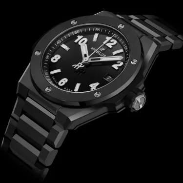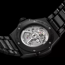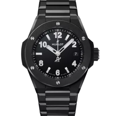 Die Hublot Big Bang Integrated Time Only Black Magic Referenz 457.CX.1270.CX hat ein poliertes schwarzes Zifferblatt, ein satiniertes und poliertes Gehäuse aus schwarzer Keramik mit 38 mm Durchmesser und eine satinierte und polierte Lünette aus schwarzer Keramik. Sie ist 100 m wasserdicht und hat ein entspiegeltes Saphirglas. Sie wird vom automatischen Uhrwerk hub1115 mit einer Gangreserve von ca. 48 Stunden angetrieben. Sie hat ein satiniertes und poliertes Armband aus schwarzer Keramik mit einer Faltschließe aus Titan.