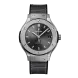 Diese Uhr hat eine feststehende Titanlünette, ein graues Zifferblatt und silberne Zeiger. Die Uhr verfügt über folgende Funktionen: Stunden, Minuten, Sekunden, Datum. Ein Datumsfenster befindet sich auf der 3-Uhr-Position. Die Uhr hat ein schwarzes Lederarmband mit einer versteckten Faltschnalle. Saphirglas schützt nur die Vorderseite dieser Uhr. Der Gehäuseboden ist transparent. Automatikuhrwerk. Gangreserve 42 Stunden. Dieses Modell ist bis zu 50 m wasserdicht. Die Uhr verfügt über ein 38 mm Titangehäuse. 565.NX.7071.LR Hublot. Titanuhr.