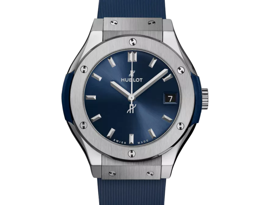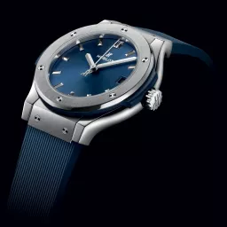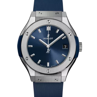 Hublot Classic Fusion Titanium Blue 33 mm, Gehäuse aus satiniertem und poliertem Titan, Lünette aus satiniertem und poliertem Titan mit 6 H-förmigen Titanschrauben, 50 m oder 5 ATM Wasserdichtigkeit, Saphirglas mit Antireflex-Behandlung, satiniertes Zifferblatt mit blauem Sonnenschliff, HUB2912 Quarzwerk, 3 bis 5 Jahre Gangreserve, blaues Kautschukarmband und Faltschließe aus Edelstahl.