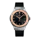 Hublot Classic Fusion Titanium King Gold, satiniertes und poliertes Titangehäuse, vertikale satinierte 18K King Gold mit 6 H-förmigen Titanschrauben Lünette, 50m oder 5 ATM Wasserdichtigkeit, Saphirglas mit Antireflex-Behandlung, mattschwarzes Zifferblatt, HUB1112 Automatikwerk, 42 Stunden Gangreserve, schwarz gefütterte Kautschukarmbänder und Edelstahl Faltschließe.