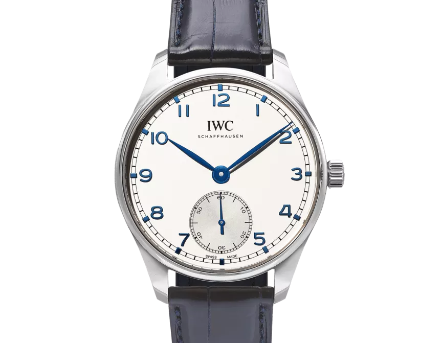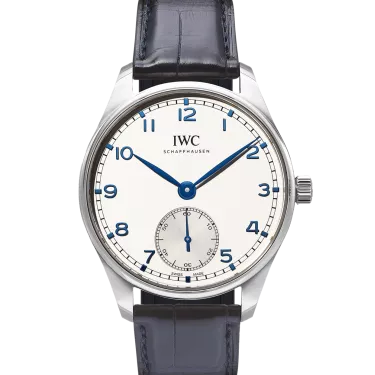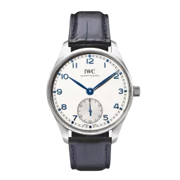 Die Herrenuhr WC Portugieser Automatic 40 (IW358304) besitzt ein 40,40-mm-Edelstahlgehäuse, das ein weißes Zifferblatt mit blauen Zeigern und Ziffern auf einem blauen Alligatorlederarmband mit Dornschließe aus Stahl umgibt. Das von IWC hergestellte Automatikkaliber 82200 verfügt über die Funktionen Stunden, Minuten und kleine Sekunde. Die Uhr verfügt über eine Gangreserve von 60 Stunden, die durch den IWC-Pellaton-Automatikaufzug aufgezogen wird, und ist wasserdicht bis 3 bar.