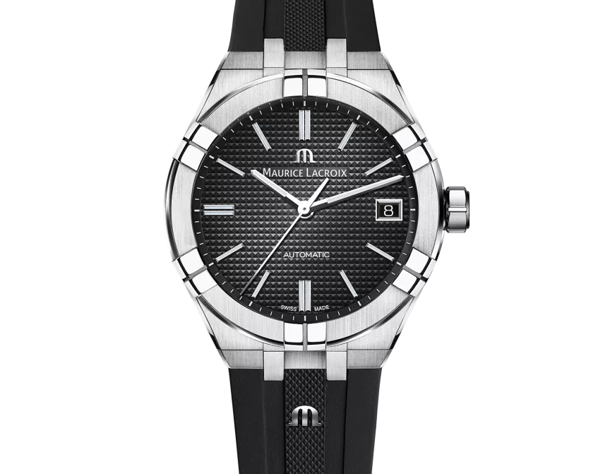 Das einfache Armbandwechsel-System der AIKON begeistert die Träger des Modells seit Jahren. Es ermöglicht dem Besitzer, ein Metallarmband ganz einfach und ohne Werkzeug gegen ein Lederarmband auszutauschen – oder umgekehrt. Heute baut Maurice Lacroix auf dieser Vielseitigkeit auf, indem die Marke eine neue Armbandreihe aus FKM-Kautschuk einführt. Diese besondere Kautschuksorte bietet im Vergleich zu normalem Gummi eine herausragende Flexibilität und erhöht den Tragekomfort. Darüber hinaus verfügt FKM-Kautschuk über eine bessere Verschleißfestigkeit, und die Farbe bleicht nicht so schnell aus. Die neuen Kautschukarmbänder sind nun mit einem „Clous de Paris“-Muster versehen und greifen so das Motiv des Zifferblatts auf. Neben der mittleren Reihe befinden sich zwei vertiefte Rillen, die auf die aus dem Gehäuse herausragenden Bandanstöße ausgerichtet sind. Die Farben der Armbänder lassen sich mit den unterschiedlichen Zifferblattfarben optimal kombinieren. Alle Armbänder sind mit einer Dornschließe aus Edelstahl ausgestattet und zeigen das „M“-Logo von Maurice Lacroix. Wasserdicht bis 20 ATM.