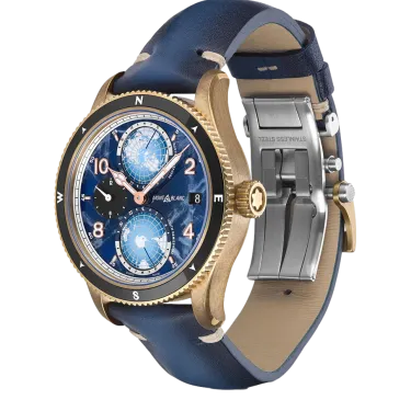 Die Uhr Montblanc 1858 Geosphere 0 Oxygen in limitierter Auflage ist vollständig sauerstofffrei, um ihre Leistung und Präzision auch unter extremen Bedingungen in den Bergen langfristig zu verbessern. Durch den fehlenden Sauerstoff im Uhrwerk wird nicht nur das Beschlagen verhindert, das bei starken Temperaturschwankungen in großer Höhe auftreten kann, sondern auch Oxidation vermieden. Ohne Sauerstoff halten die Komponenten viel länger und bieten langfristig eine höhere Präzision. Die Uhr verfügt über ein 42-mm-Gehäuse aus Bronze mit einer bidirektionalen, gerändelten Keramiklünette mit lumineszierenden Himmelsrichtungen und einem Zifferblatt mit dem Gletschermotiv des Hauses. Der Zeitmesser wird vom Automatikwerk MB 29.25 mit einer Manufakturkomplikation angetrieben. Wie bei allen Modellen der 1858 Geosphere werden die Nord- und Südhalbkugel durch zwei dreidimensionale Globen dargestellt und verfügen über eine Tag- und Nachtanzeige, sodass der Träger die Uhrzeit überall auf der Welt auf einen Blick ablesen kann.