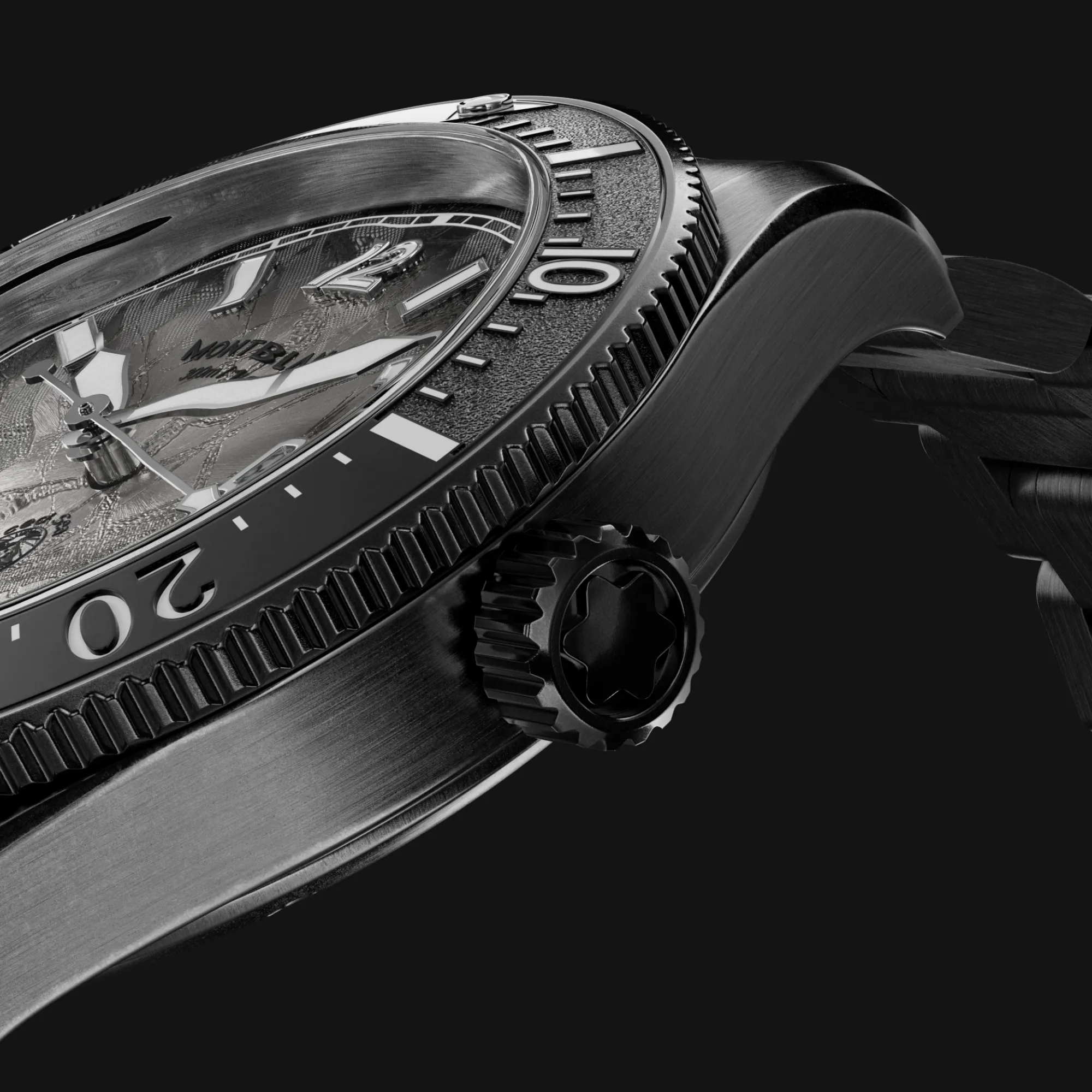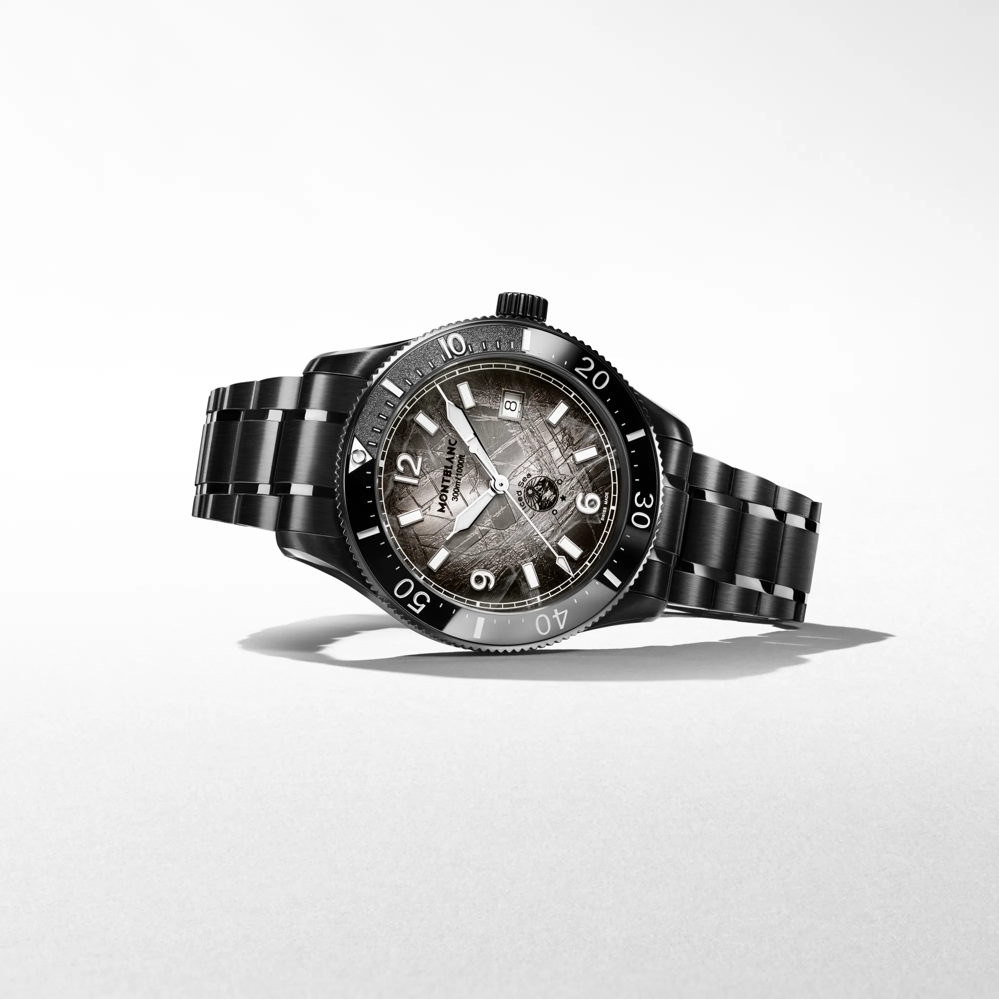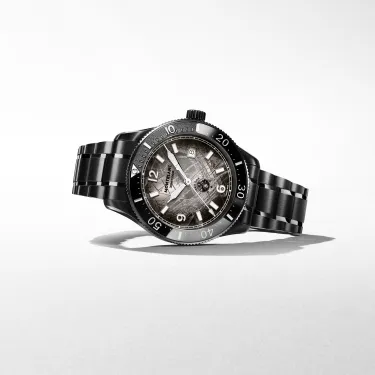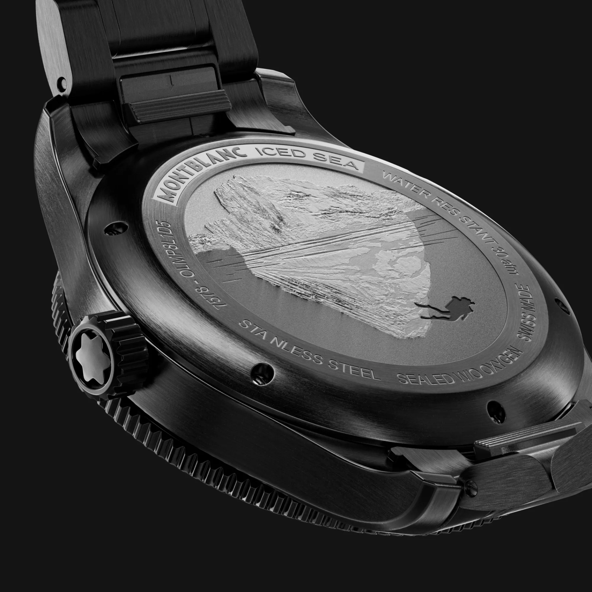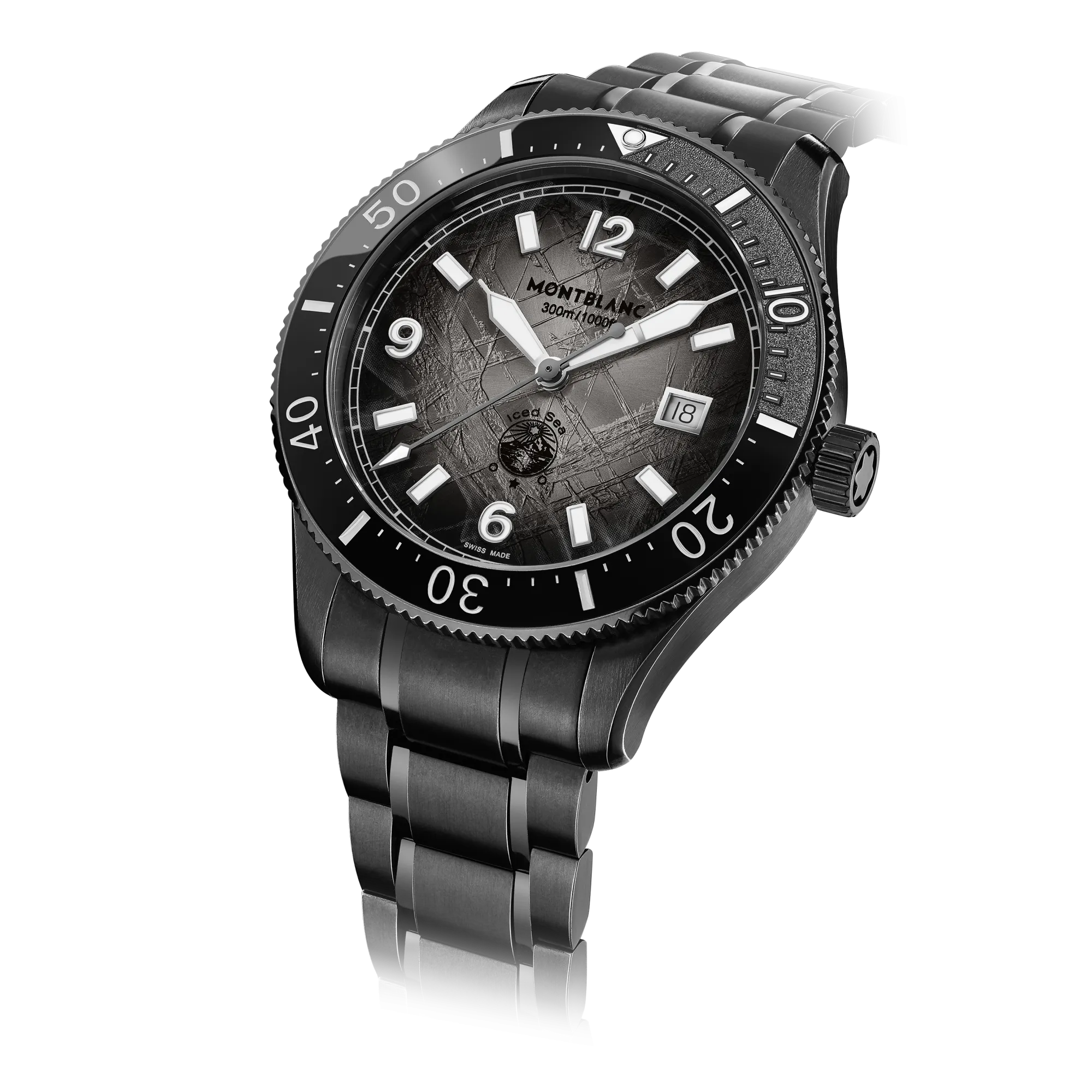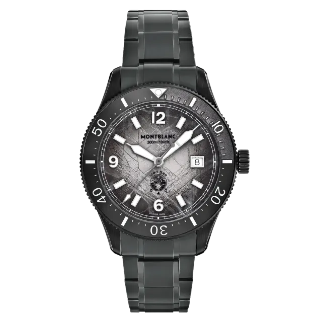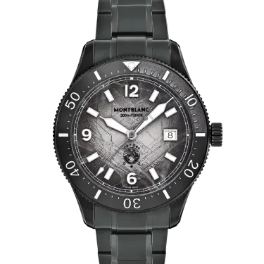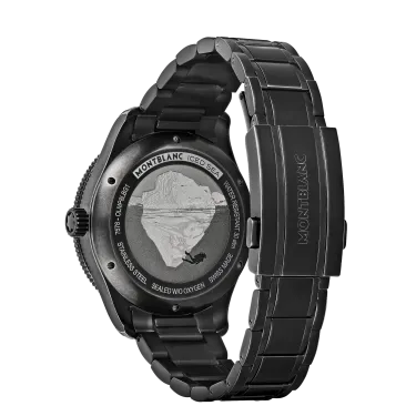 Die Montblanc Iced Sea Automatic Date 0 Oxygen mit ihrem grauen Zifferblatt im Sfumato-Gletschermuster vermittelt den Eindruck, als blicke man in die Tiefen eines Gletschers. Inspiriert vom Mer de Glace wurde diese Gletscherstruktur mithilfe einer fast vergessenen traditionellen Technik namens „Gratté-Boisé“ erzielt. Die Uhr ist in einem 41-mm-Gehäuse aus Distressed-Stahl untergebracht, das vollständig sauerstofffrei ist, und verfügt über eine einseitig drehbare Lünette mit einem schwarzen Keramikeinsatz, der per Laser von 0 bis 15 Minuten vertieft wurde, eine 3D-Gravur auf dem Gehäuseboden sowie ein austauschbares Distressed-Stahlarmband mit Feineinstellsystem. Die Uhr entspricht der Norm ISO 6425 für das Tauchen und ist bis 300 Meter wasserdicht.