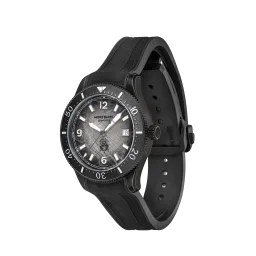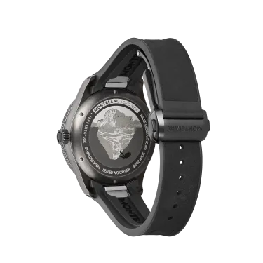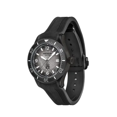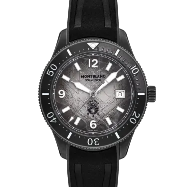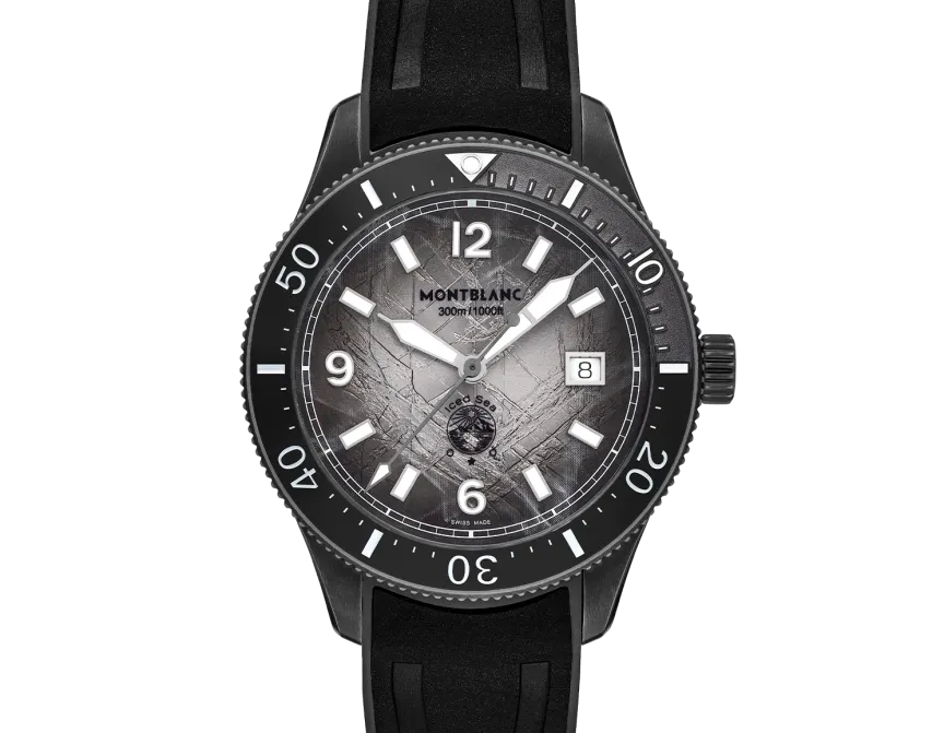 Die Montblanc Iced Sea Automatic Date 0 Oxygen mit grauem Sfumato-Gletschermuster auf dem Zifferblatt vermittelt den Eindruck, als würde man in die Tiefen eines Gletschers blicken. Inspiriert von der Mer de Glace wurde diese Gletscherstruktur mit einer fast vergessenen traditionellen Technik namens „gratté-boisé” erzielt. Die Uhr ist in einem 41 mm großen Gehäuse aus Distressed-Stahl untergebracht, das vollständig sauerstofffrei ist, und verfügt über eine einseitig drehbare Lünette mit schwarzem Keramikeinsatz, der per Laser von 0 bis 15 Minuten vertieft ist, eine 3D-Gravur auf dem Gehäuseboden und ein austauschbares schwarzes Kautschukarmband mit Feineinstellungssystem. Die Uhr entspricht der Norm ISO 6425 für Taucheruhren und ist bis zu einer Tiefe von 300 Metern wasserdicht.
