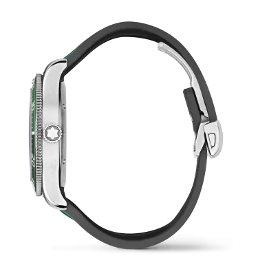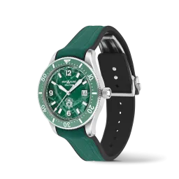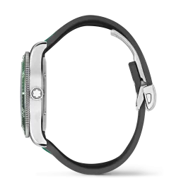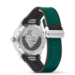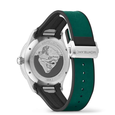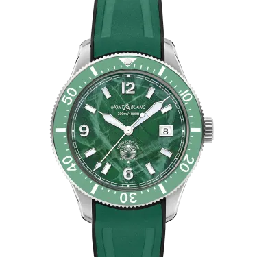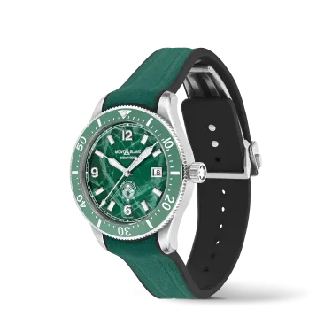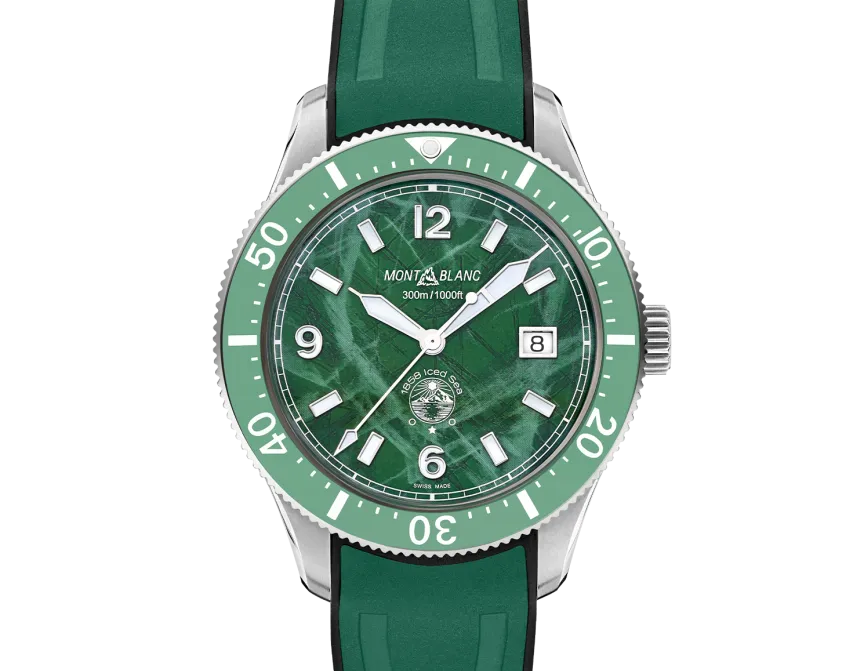 Die Montblanc Iced Sea Automatic Date ist die erste Sporttauchuhr von Montblanc und verfügt über ein Zifferblatt mit Gletschermuster, das den Eindruck vermittelt, in die Tiefen eines Gletschers zu blicken. Dieses grüne Zifferblatt mit Gletschermuster ist von der Mer de Glace – dem Eismeer – dem Hauptgletscher des Mont-Blanc-Massivs inspiriert. Seine Textur wurde mit einer fast vergessenen traditionellen Technik namens „gratté-boisé” erzielt. Die Uhr ist in einem 41-mm-Edelstahlgehäuse untergebracht und verfügt über eine einseitig drehbare zweifarbige Keramiklünette, einen gravierten Gehäuseboden und ein konisches, austauschbares Edelstahlarmband mit Feineinstellung für präzisen Sitz. Die Uhr entspricht der Norm ISO 6425 für Taucheruhren und ist bis 300 Meter wasserdicht.