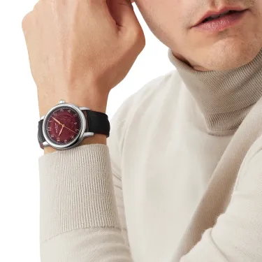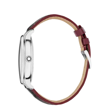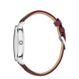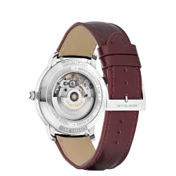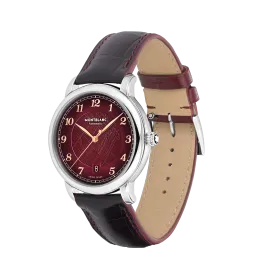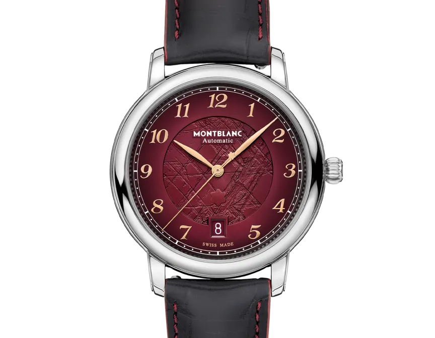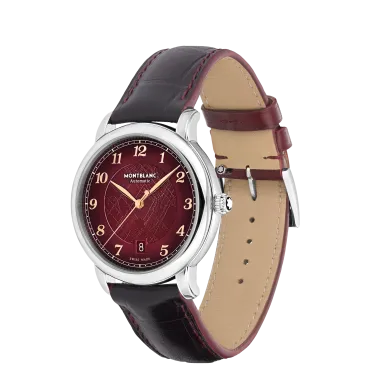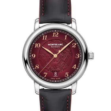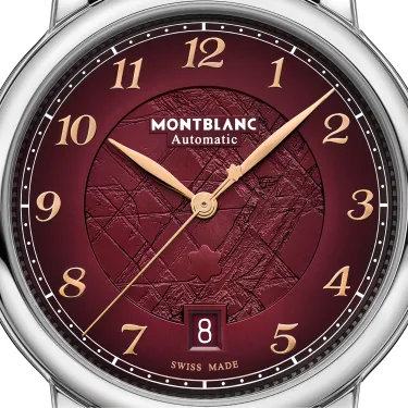 Die Uhr Montblanc Star Legacy Automatic Date Limited Edition 1786 Stück ist eine Hommage an den unerschrockenen Jacques Balmat, den ersten Bergsteiger, der 1786 den Mont Blanc bestieg. Der Zeitmesser verfügt über ein burgunderrotes Zifferblatt mit Gletschermuster, dessen Rand mit einem Sfumato-Effekt verziert ist. Außerdem verfügt er über ein Sprungzifferblatt, rosévergoldete Zeiger und Ziffern sowie das Montblanc-Emblem auf dem Gegengewicht des Sekundenzeigers. Dieses Modell wird vom Automatikwerk MB 24.17 angetrieben und zeigt die Stunden, Minuten, Sekunden und das Datum an. Die Uhr befindet sich in einem 39-mm-Edelstahlgehäuse mit durchbrochenem Boden, der den Blick auf das Uhrwerk freigibt. Sie wird mit einem austauschbaren Armband aus Kalbsleder mit Alligatorprägung und vertikalem Sfumato-Effekt geliefert.