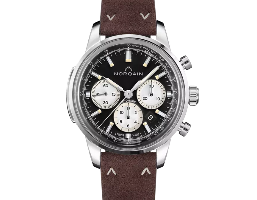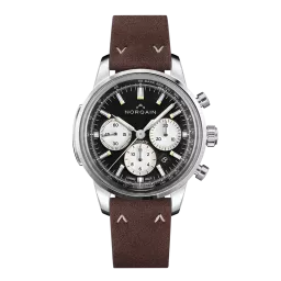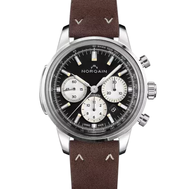 Ebenso klar wie funktional besitzt diese Freedom 60 Chrono ein schwarzes Zifferblatt mit weissen, kleinen Zifferblättern bei 3, 6 und 9 Uhr. Zwischen 4 und 5 Uhr befindet sich eine Datumsanzeige. Der 43-mm-Chronograph aus Edelstahl hat eine glatte, passende Lünette. Das Norlando Lederarmband weist vor den Bandanstössen die charakteristischen „NORQAIN Stiche“ auf, die Bergspitzen nachempfunden sind – wähle aus vielen verschiedenen Farben. Das NORQAIN Kaliber NN18 mit automatischem Aufzug ist durch den Gehäuseboden aus Saphirglas sichtbar.