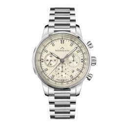 Mit einer Freedom 60 am Handgelenk spürt man die Energie der 60er-Jahre. Die Uhr stellt den ersten Schritt zu einem unabhängigen Lebensstil dar und bereitet den Weg für neue Abenteuer vor. Modelle dieser Serie sind der perfekte Begleiter für deine persönliche Reise. Ebenso klar wie funktional besitzt diese Freedom 60 Chrono ein cremefarbenes Zifferblatt mit passenden Zifferblättern bei 3, 6 und 9 Uhr. Zwischen 4 und 5 Uhr befindet sich eine Datumsanzeige. Der 43-mm-Chronograph aus Edelstahl hat eine glatte, passende Lünette. Das Norlando Lederarmbandweist vor den Bandanstössen die charakteristischen „NORQAIN Stiche“ auf, die Bergspitzen nachempfunden sind – wähle aus vielen verschiedenen Farben. Das NORQAIN Kaliber NN18 mit automatischem Aufzug ist durch den Gehäuseboden aus Saphirglas sichtbar.