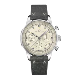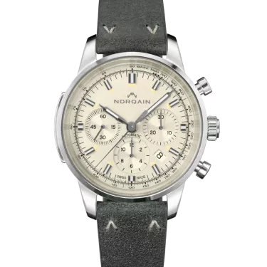 Mit einer Freedom 60 am Handgelenk spürt man die Energie der 60er-Jahre. Die Uhr stellt den ersten Schritt zu einem unabhängigen Lebensstil dar und bereitet den Weg für neue Abenteuer vor. Modelle dieser Serie sind der perfekte Begleiter für deine persönliche Reise. Ebenso klar wie funktional besitzt diese Freedom 60 Chrono ein cremefarbenes Zifferblatt mit passenden Zifferblättern bei 3, 6 und 9 Uhr. Zwischen 4 und 5 Uhr befindet sich eine Datumsanzeige. Der 43-mm-Chronograph aus Edelstahl hat eine glatte, passende Lünette. Das Norlando Lederarmbandweist vor den Bandanstössen die charakteristischen „NORQAIN Stiche“ auf, die Bergspitzen nachempfunden sind – wähle aus vielen verschiedenen Farben. Das NORQAIN Kaliber NN18 mit automatischem Aufzug ist durch den Gehäuseboden aus Saphirglas sichtbar.