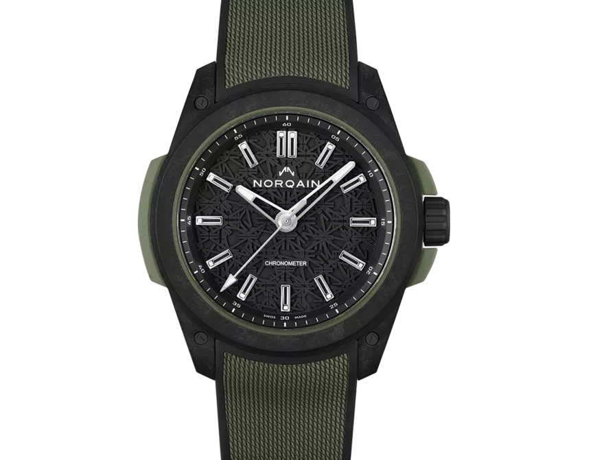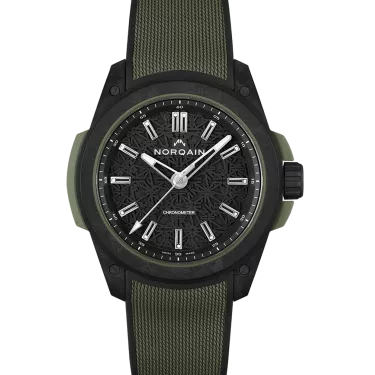 Dieses Wild ONE Modell verfügt über ein schwarzes, lasergeschnittenes Zifferblatt mit drei Ebenen und einem vom NORQAIN Logo inspiriertem Mandala-Muster. Dieses Modell hat ein schwarzes NORTEQ Gehäuse mit Marmoreffekt. Der khakifarbene Kautschuk-Stossdämpfer, welcher den Titanbehälter, in dem das Manufakturkaliber NN20/1 sitzt, umschliesst, ist durch das schützende NORTEQ Gehäuse sichtbar. Die «NORQAIN Plate» aus demselben schwarzen NORTEQ Material befindet sich an der Seite des Gehäuses. Die Stunden-, Minuten- und Sekundenzeiger sind skelettiert, wie bei allen anderen Uhren der Independence Kollektion. Dieses Modell ist mit einem schwarzen oder khakifarbenen integrierten Kautschukarmband mit Petite-Milanaise-Struktur erhältlich.