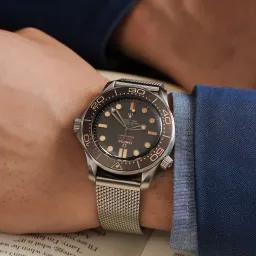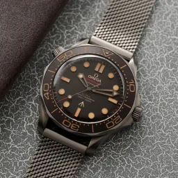 Diese Seamaster mit einem Durchmesser von 42 mm ist identisch mit der Uhr von 007 in „Keine Zeit zu sterben“, besteht aus robustem und doch leichtem Titan Grade 2 und weist einen Lünettenring sowie ein Zifferblatt aus braunem Aluminium auf.