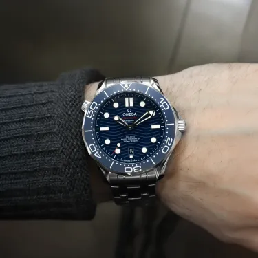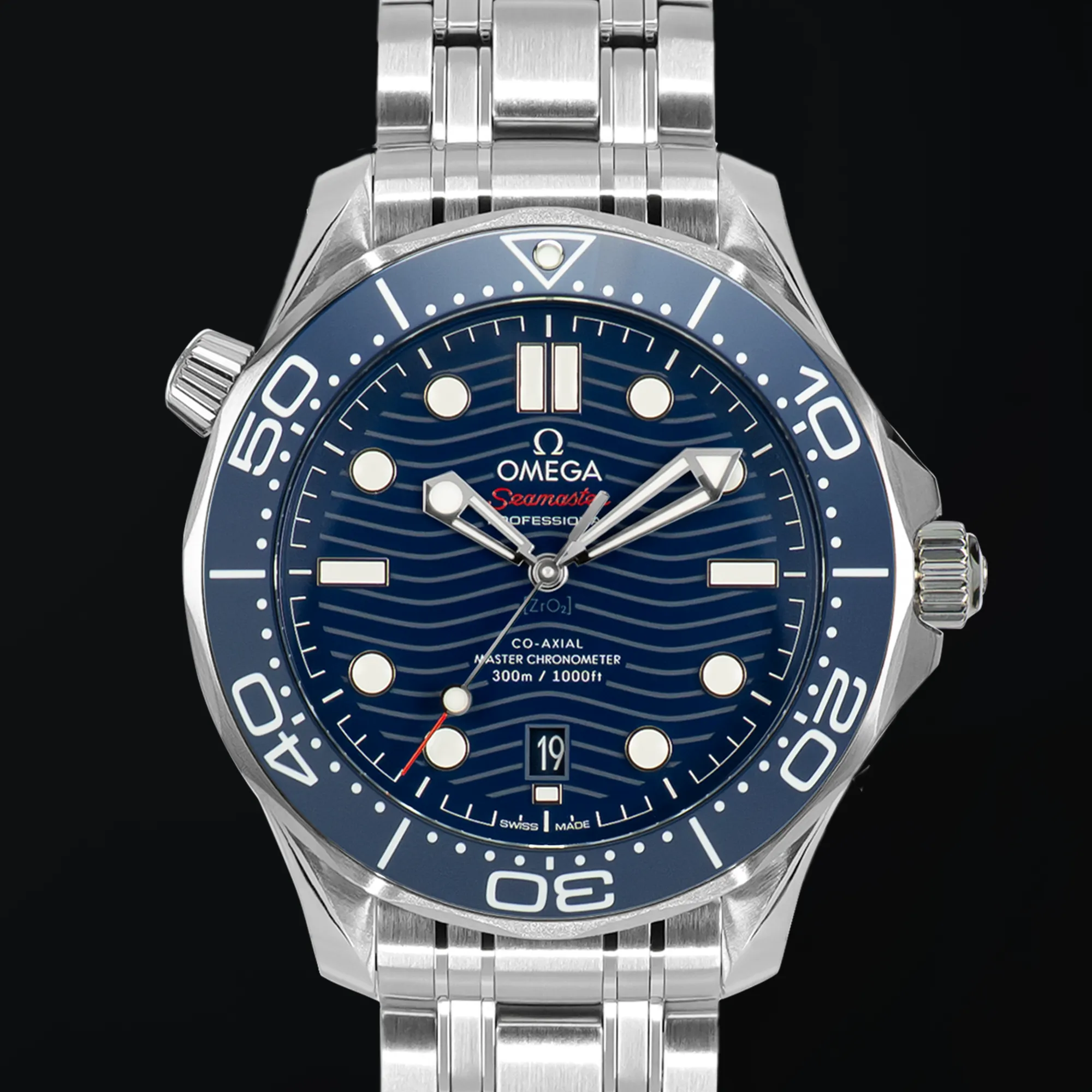 Dieses 42-mm-Modell aus Edelstahl besticht durch eine blaue Keramiklünette mit einer Tauchskala aus weißem Email. Das Zifferblatt besteht ebenfalls aus polierter blauer Keramik und verfügt ferner über lasergravierte Wellen und ein Datumsfenster bei 6 Uhr.
