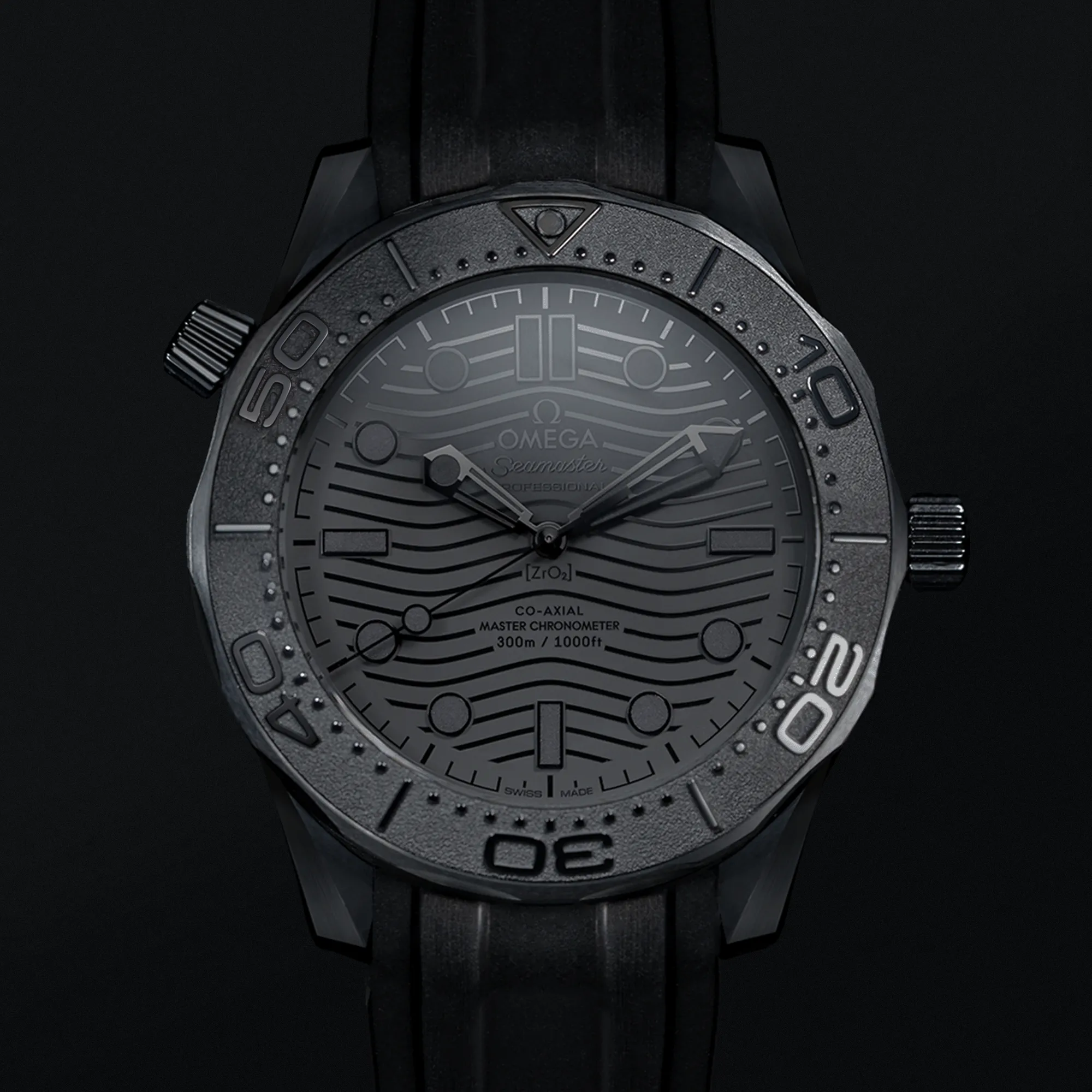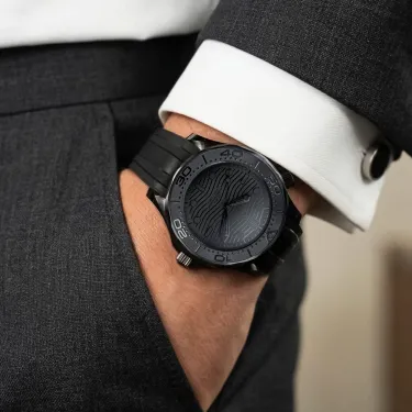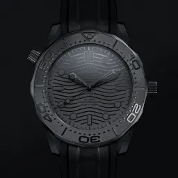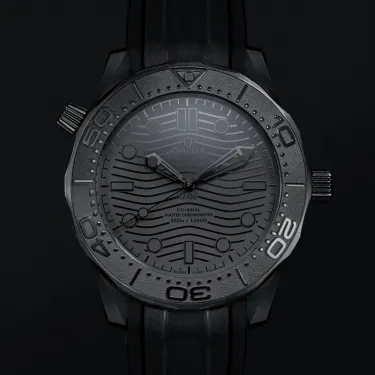 Dieses 43,5 mm große Modell hat ein schwarzes Keramikgehäuse und ein schwarzes Zifferblatt mit einem gewölbten, kratzfesten und beidseitig entspiegelten Saphirglas. Schwarzes Kautschukarmband mit Dornschließe aus Cermic.