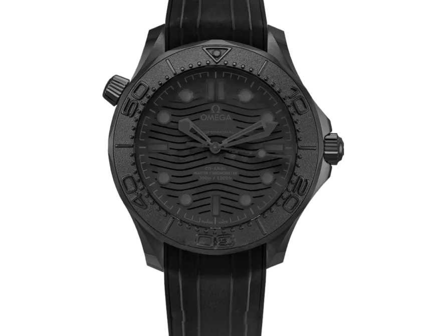 Dieses 43,5 mm große Modell hat ein schwarzes Keramikgehäuse und ein schwarzes Zifferblatt mit einem gewölbten, kratzfesten und beidseitig entspiegelten Saphirglas. Schwarzes Kautschukarmband mit Dornschließe aus Cermic.