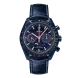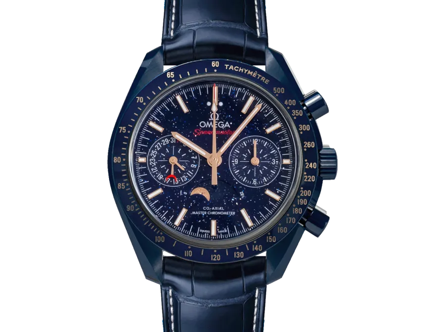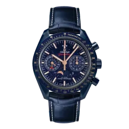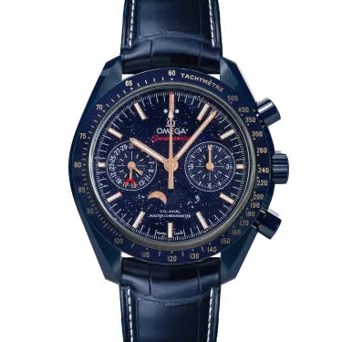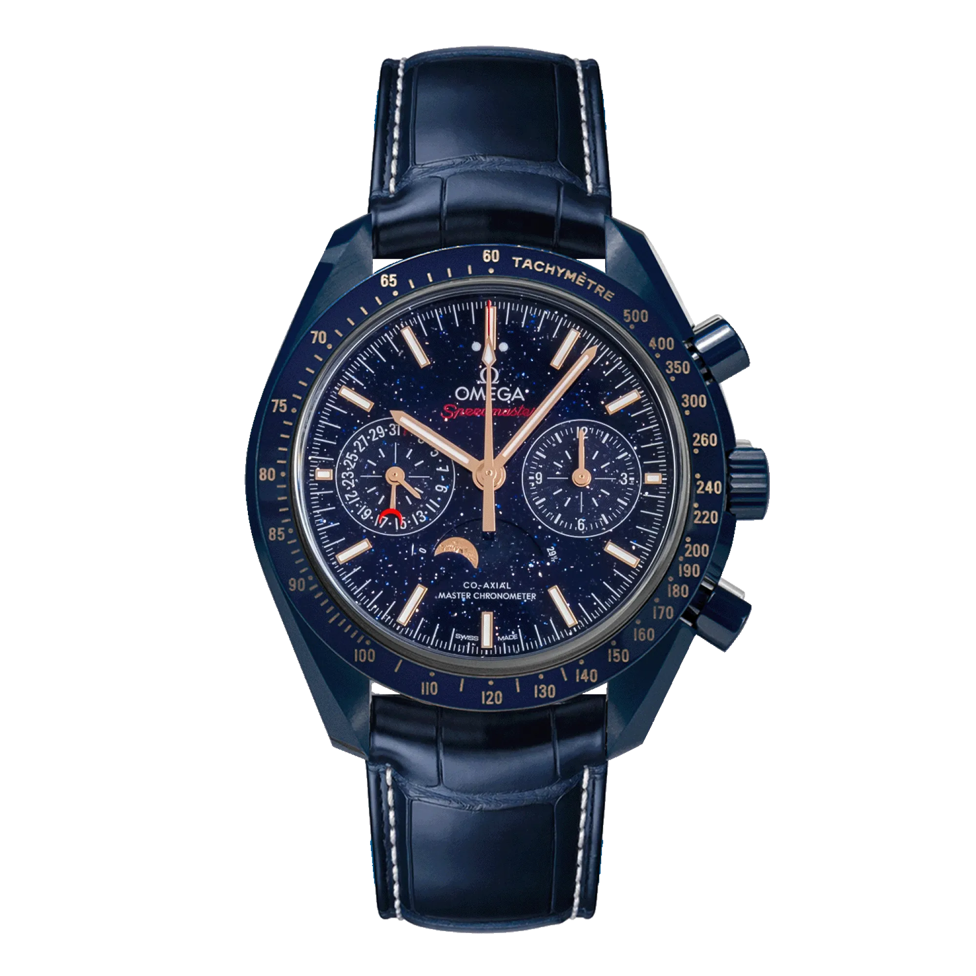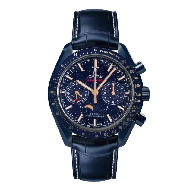 Der 44,25-mm-Chronograph verfügt über ein blaues Keramikgehäuse, das von einem blauen Lünettenring aus Keramik mit Tachymeterskala aus OMEGA Ceragold™ ergänzt wird. Er wird von einem blauen Lederarmband mit Faltschließe aus blauer Keramik und keramisiertem Titan am Handgelenk gehalten. Das Zifferblatt aus blauem Aventuringlas verfügt über Indizes und Zeiger aus 18 K Sedna™-Gold sowie einen Datumszeiger mit roter Spitze. Bei 6 Uhr befindet sich die Mondphasenanzeige, die eine Mondscheibe aus blauem Aventuringlas und Email aufweist (angemeldetes Patent), auf der sowohl die erdzugewandte als auch die erdabgewandte Seite des Mondes aus Sedna™-Gold zu sehen ist. Angetrieben wird dieser Zeitmesser vom OMEGA Master Chronometer-Kaliber 9904, das vom Eidgenössischen Institut für Metrologie (METAS) gemäß den höchsten Branchenstandards zertifiziert wurde.