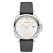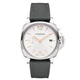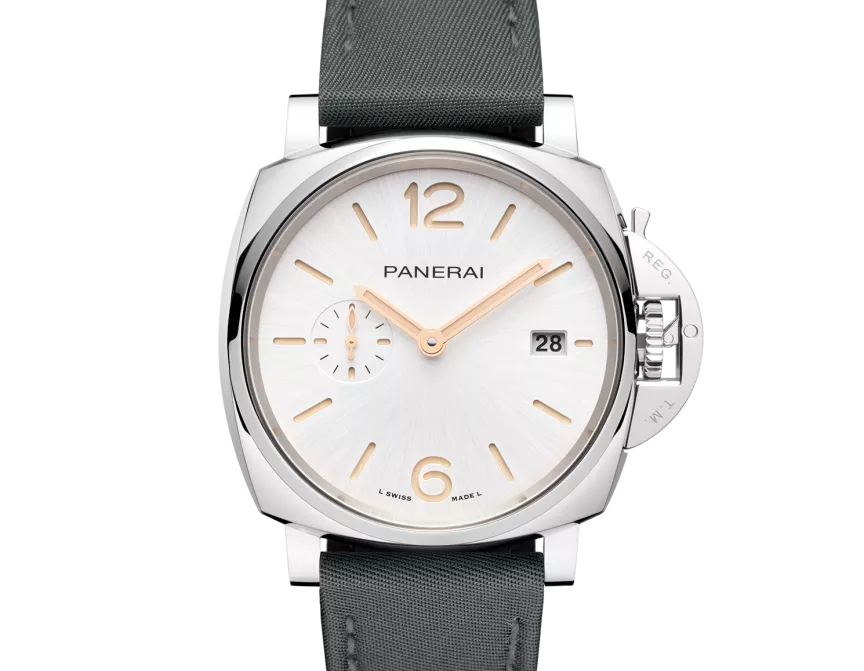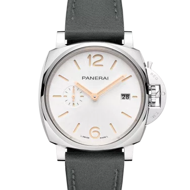 Mechanische Automatik, Kaliber P.900, 12 ½ linig, 4,2 mm dick, 23 Lagersteine, 28.800 Halbschwingungen/Stunde. Incabloc® Anti-Schock-Vorrichtung. Gangreserve 3 Tage, ein Federhaus. 171 Bestandteile. 42-mm-Gehäuse aus poliertem Stahl, weißes Sonnenschliffgehäuse mit arabischen Ziffern und Stundenmarkierungen mit Leuchtmasse. Datum bei 3 Uhr und kleine Sekunde bei 9 Uhr. "Wasserdichtigkeit 5,0 bar (~50,0 Meter). Prada Re-Nylonband Anthrazit, T/T-Naht, STD, 22/18, BA mit Faltschließe aus poliertem Stahl, 18 mm, PAM Click Release System™.