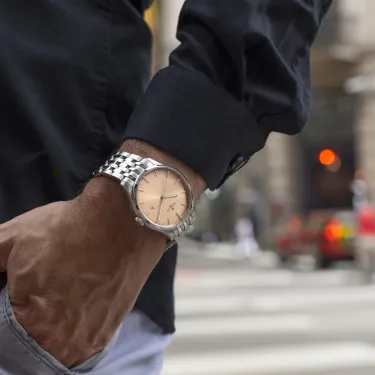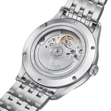 Das 39-mm-Gehäuse aus poliertem und gebürstetem Edelstahl ist bis 5 bar wasserdicht und passt bequem an jedes Handgelenk. Wer seinen Stil variieren möchte, kann zwischen einem Kalbslederarmband im Krokodil-Look und einem sportlicheren Stahlarmband wählen.
