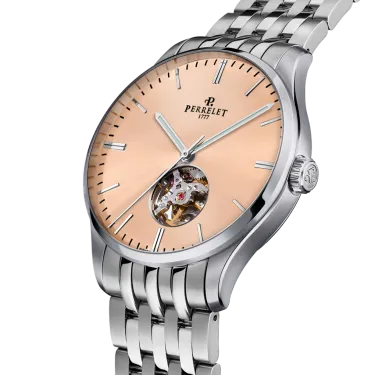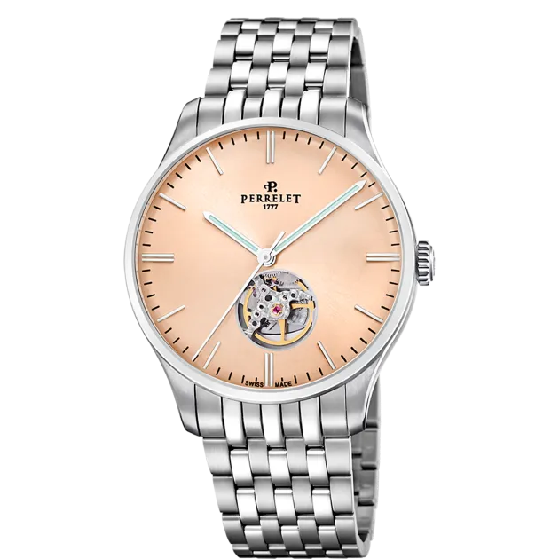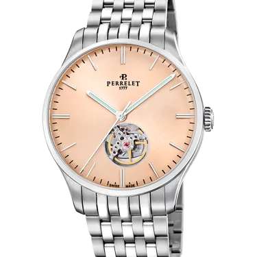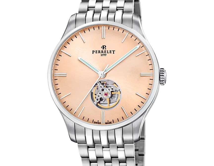 Ein klassisches und zeitloses Design mit modernem Touch, das Uhrenliebhaber anspricht, die elegante und exklusive Zeitmesser suchen. Das Modell WEEKEND Open Heart legt besonderen Wert auf die Schweizer mechanische Uhrmacherkunst, da es durch eine sichtbare Öffnung bei 6 Uhr einen Teil des Uhrwerks freigibt. Perrelet bietet seinen Kunden hochwertige mechanische und automatische Uhren, die direkt auf die feinste Uhrmachertradition seit 1777 zurückgehen.