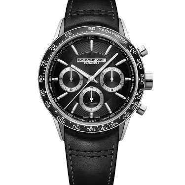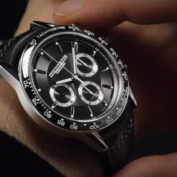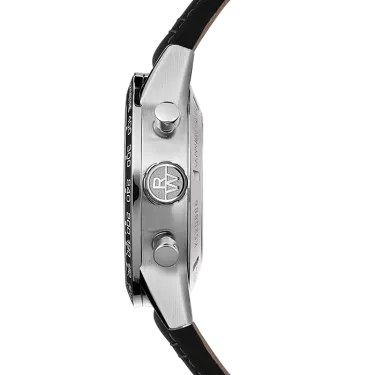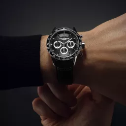Die Lünette mit schwarzer, kratzfester Keramikeinlage und Tachymeterskala trägt zu dem edlen und luxuriösen Erscheinungsbild der Uhr bei. Das schwarze Zifferblatt mit einer azurierten Stundenskala und die mit silberfarbenen Ringen gerahmten Zähler verleihen dem Modell den letzten Schliff.