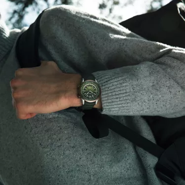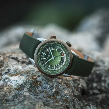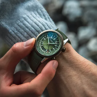 Die freelancer GMT Worldtimer zeigt die aktuelle Ortszeit in 24 Zeitzonen zugleich an und verfügt über einen Durchmesser von 40,5 mm sowie eine Dicke von 9,7 mm. Das Zifferblatt dieses Modells ist mit einer rotierenden Spur ausgestattet, auf der für jede Zeitzone eine bedeutende Stadt vermerkt ist. Neben dieser Städtescheibe befindet sich eine 24-Stunden-Skala, die die aktuelle Tag- oder Nachtzeit am jeweiligen Ort angibt. Tonnenförmige Stunden- und Minutenzeiger weisen auf die lokale Zeit hin. Wird die an der Seite mit einem Weltkartensymbol versehene Krone auf der 4-Uhr-Position gedreht, so kann der Träger seinen derzeitigen Standort bei 12 Uhr einstellen und somit die aktuelle Uhrzeit in den verbleibenden 23 Zeitzonen ablesen. Zusätzlich zu der rotierenden Städtescheibe verfügt das Modell über einen grünen GMT-Zeiger mit einer ins Auge fallenden, dreieckigen Spitze in Rot und Weiß, die die aktuelle Uhrzeit in der Heimat angibt.