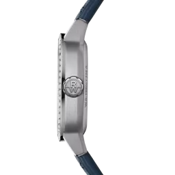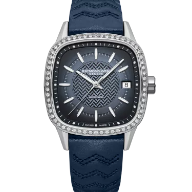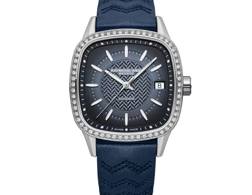 Das Zifferblatt mit blauem Farbverlauf zieht den Blick auf die Zifferblattmitte, die von einem faszinierenden, W-förmigen Muster geziert wird. Diese Anspielung auf die Marke RAYMOND WEIL sorgt für optische Tiefe sowie ein subtiles Spiel mit Licht und Schatten, das den Träger in seinen Bann zieht
