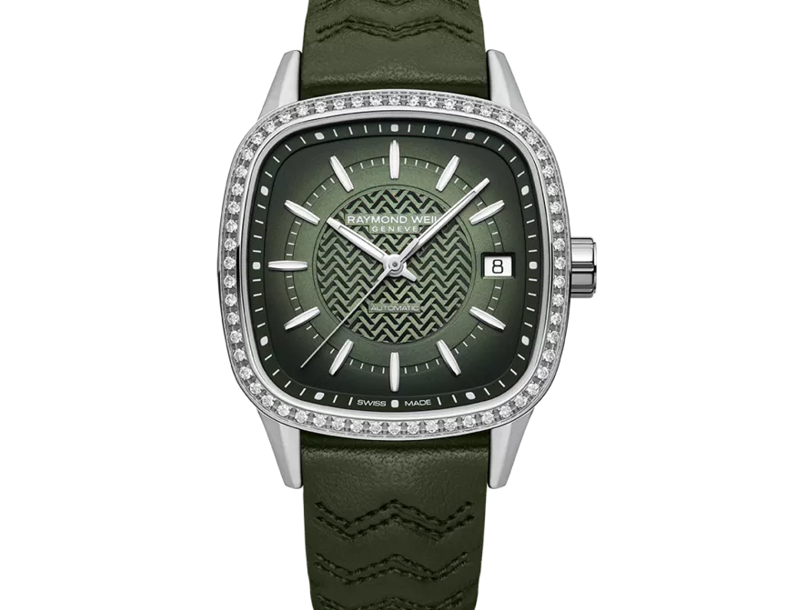 Das Zifferblatt mit grünem Farbverlauf zieht den Blick auf die Zifferblattmitte, die von einem faszinierenden, W-förmigen Muster geziert wird. Diese Anspielung auf die Marke RAYMOND WEIL sorgt für optische Tiefe sowie ein subtiles Spiel mit Licht und Schatten, das den Träger in seinen Bann zieht.