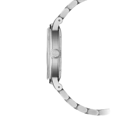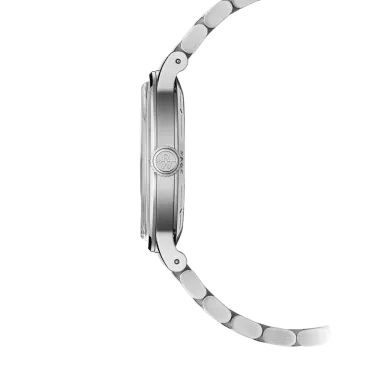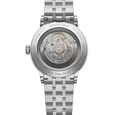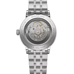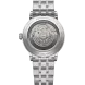 Die Lünette ist mit einem vertikalen Satin-Strich verziert, der wunderschön mit der daneben liegenden, hochglanzpolierten Abschrägung kontrastiert. Diese Nebeneinanderstellung zweier Verarbeitungen verleiht dem Modell ein besonders aufwendiges Finish. Der Gehäuseboden aus Saphirglas gibt den Blick auf das Automatikwerk im Herzen der Uhr sowie die für RAYMOND WEIL charakteristische W-förmige Schwungmasse frei. Das Edelstahlarmband rundet dieses millesime-Modell gekonnt ab.