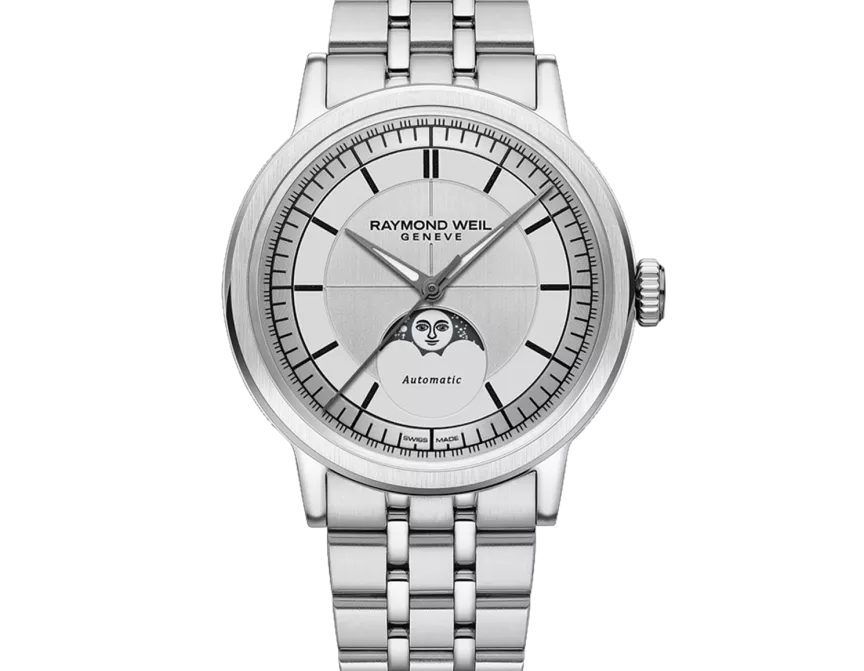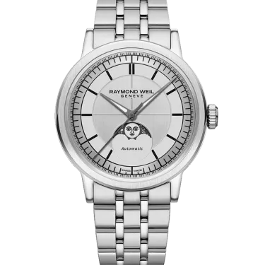 Die millesime mit Mondphasenanzeige haucht dieser klassischen Komplikation neues Leben ein. Das optisch unterteilte, grafisch gestaltete Zifferblatt ermöglicht dem Träger eine dynamische und intuitive Ablesung der Mondphasen. Die Einführung der Mondphasenanzeige, einer emblematischen Uhrenfunktion, läutet eine neue Welle kreativer Eleganz für RAYMOND WEIL ein.