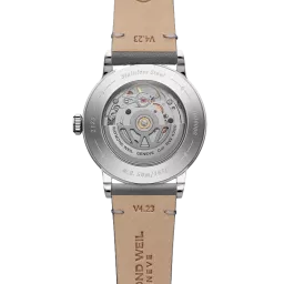 Die Lünette ist mit einem vertikalen Satin-Strich verziert, der wunderschön mit der daneben liegenden, hochglanzpolierten Abschrägung kontrastiert. Diese Nebeneinanderstellung zweier Verarbeitungen verleiht dem Modell ein besonders aufwendiges Finish. Der Gehäuseboden aus Saphirglas gibt den Blick auf das Automatikwerk im Herzen der Uhr sowie die für RAYMOND WEIL charakteristische W-förmige Schwungmasse frei.