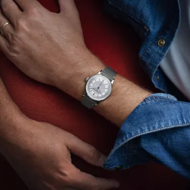 Das Modell 2125 vereint eine moderne Sensibilität mit der Neo-Vintage-Optik. Diese Uhr mit zentraler Sekunde ist in drei markanten Zifferblattfarben – Silber, Jeansblau und Weinrot – erhältlich und besticht durch geometrische Linien und ein Sektorzifferblatt.