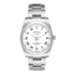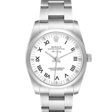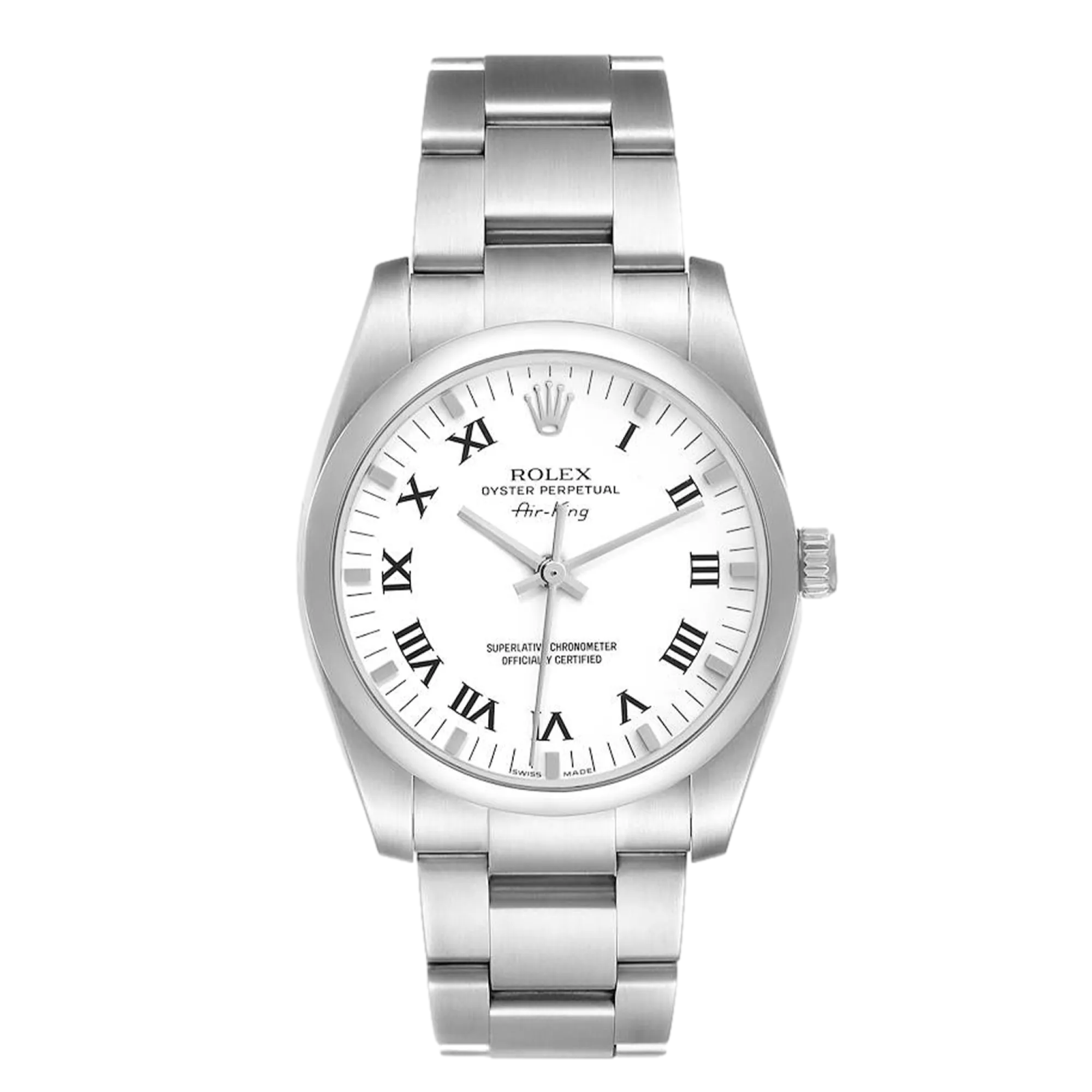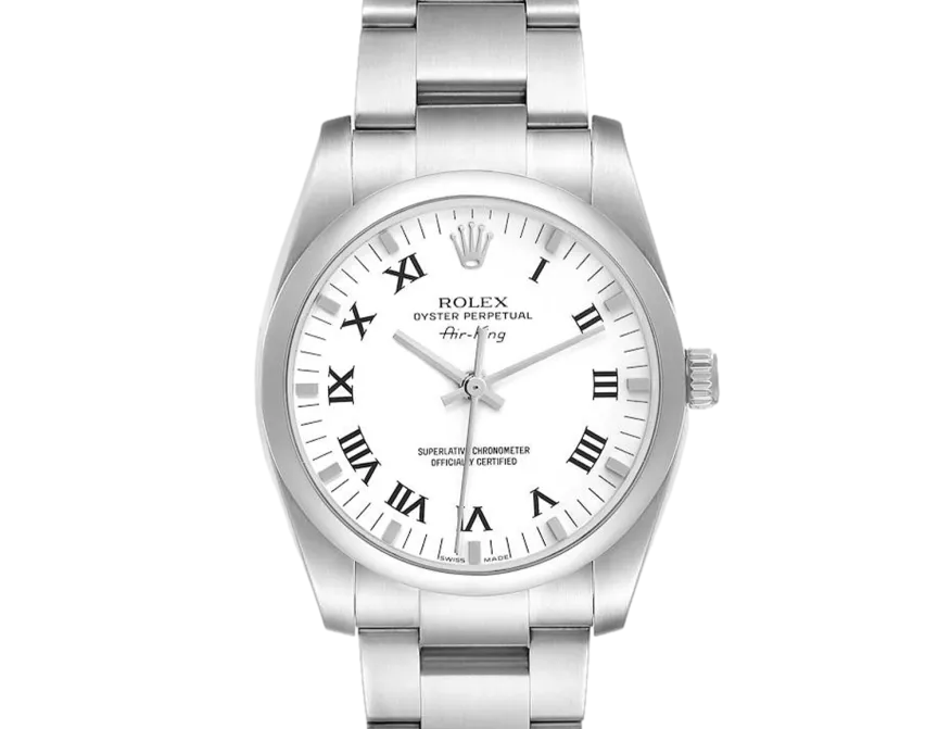 Rolex Air-King 114200 Uhrwerk: Automatik Gehäusegröße: 34 mm Gehäusematerial: Stahl Armbandmaterial: Stahl (Oyster) Zifferblatt: Weiß mit römischen Ziffern Wasserdichtigkeit: 100 Meter