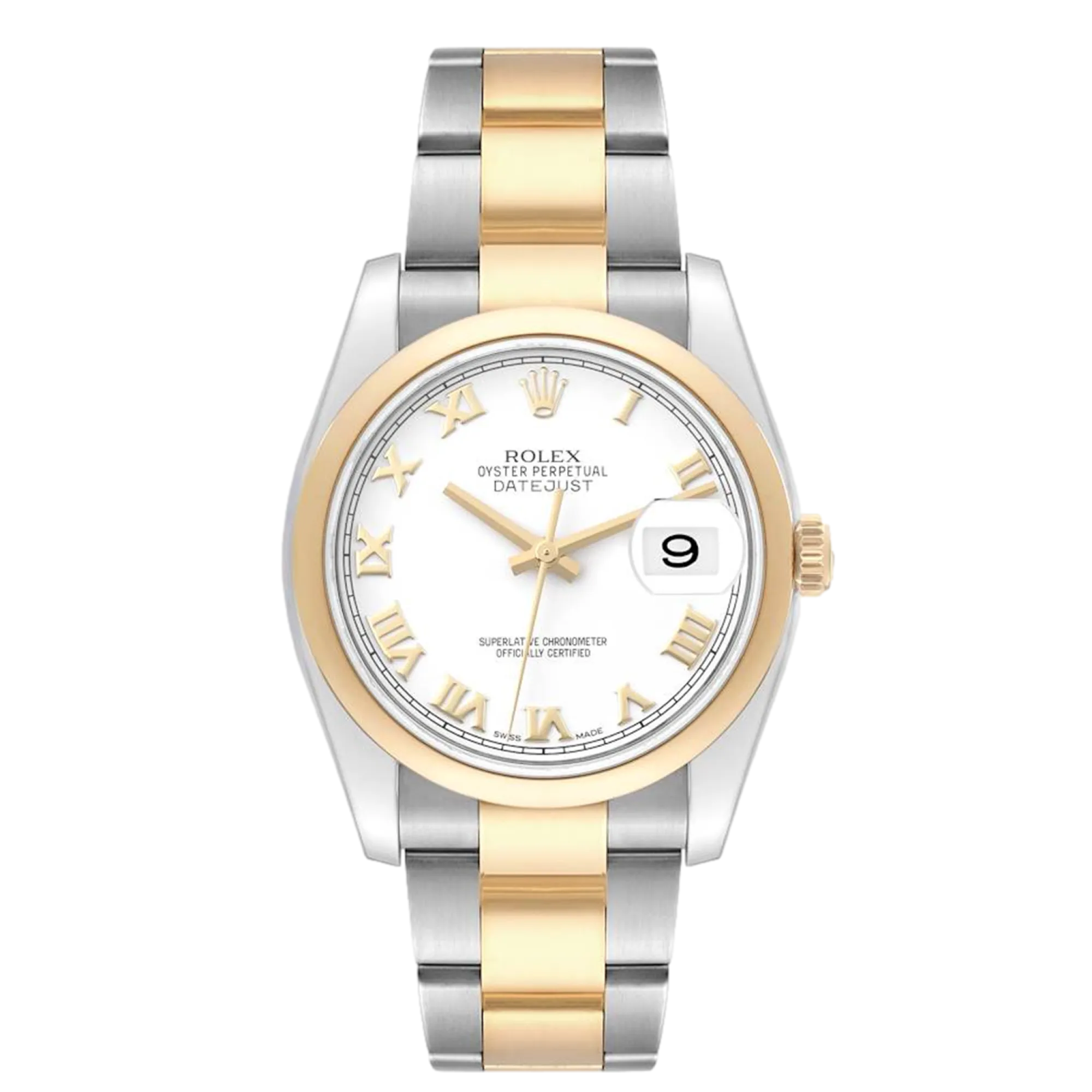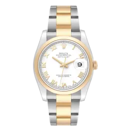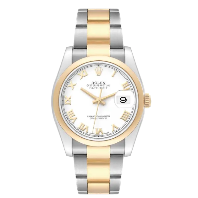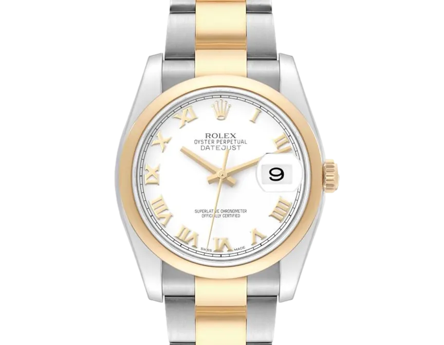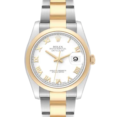 Rolex Datejust 116203 Uhrwerk: Automatik Gehäusegröße: 36 mm Gehäusematerial: Stahl und Gelbgold Armbandmaterial: Stahl und Gelbgold (Oyster) Zifferblatt: Weiß mit römischen Ziffern Wasserdichtigkeit: 100 Meter