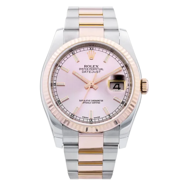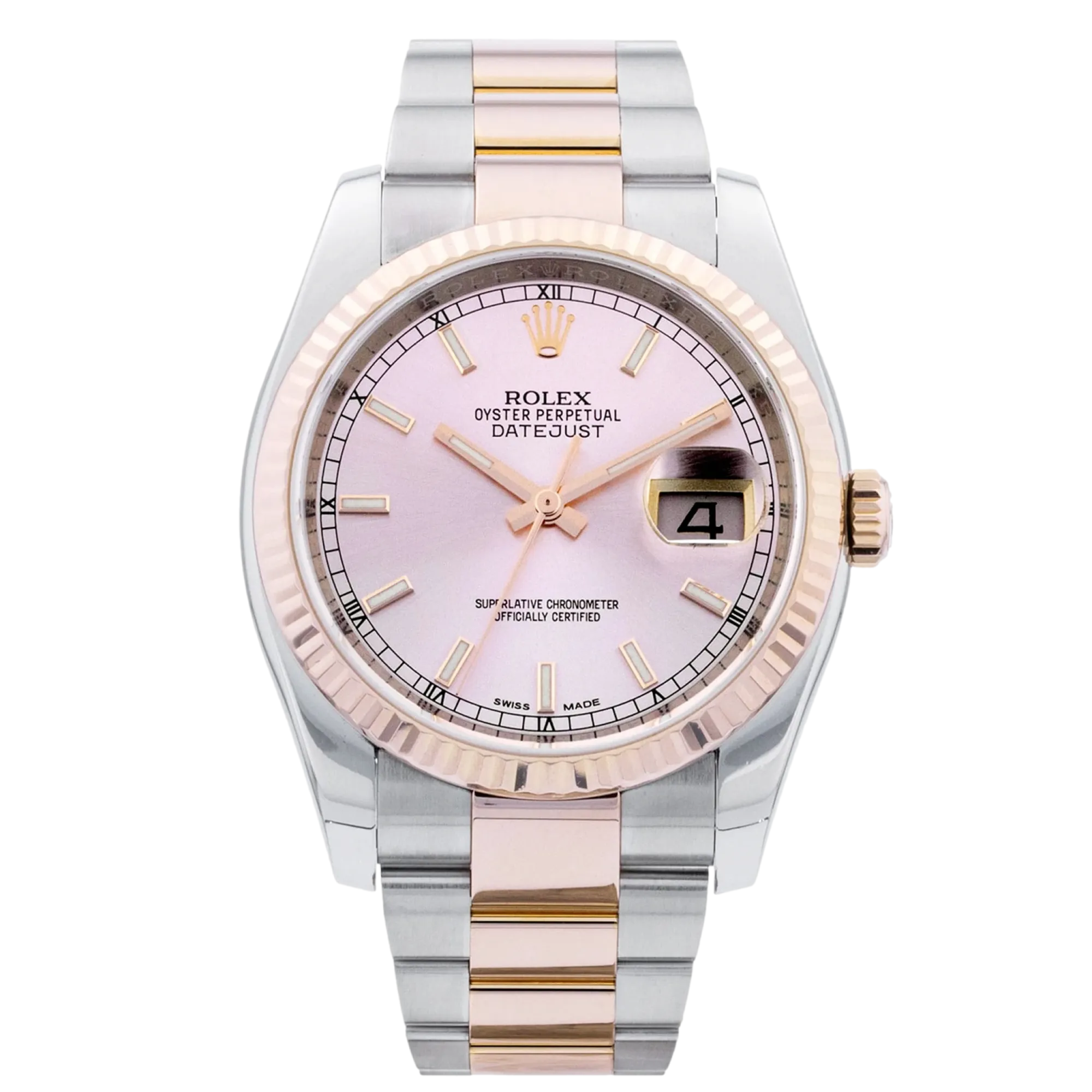 Rolex Datejust 116231 Uhrwerk: Automatik Gehäusegröße: 36 mm Gehäusematerial: Stahl und Roségold Armbandmaterial: Stahl und Roségold (Oyster) Zifferblatt: Pink Baton Wasserdichtigkeit: 100 Meter