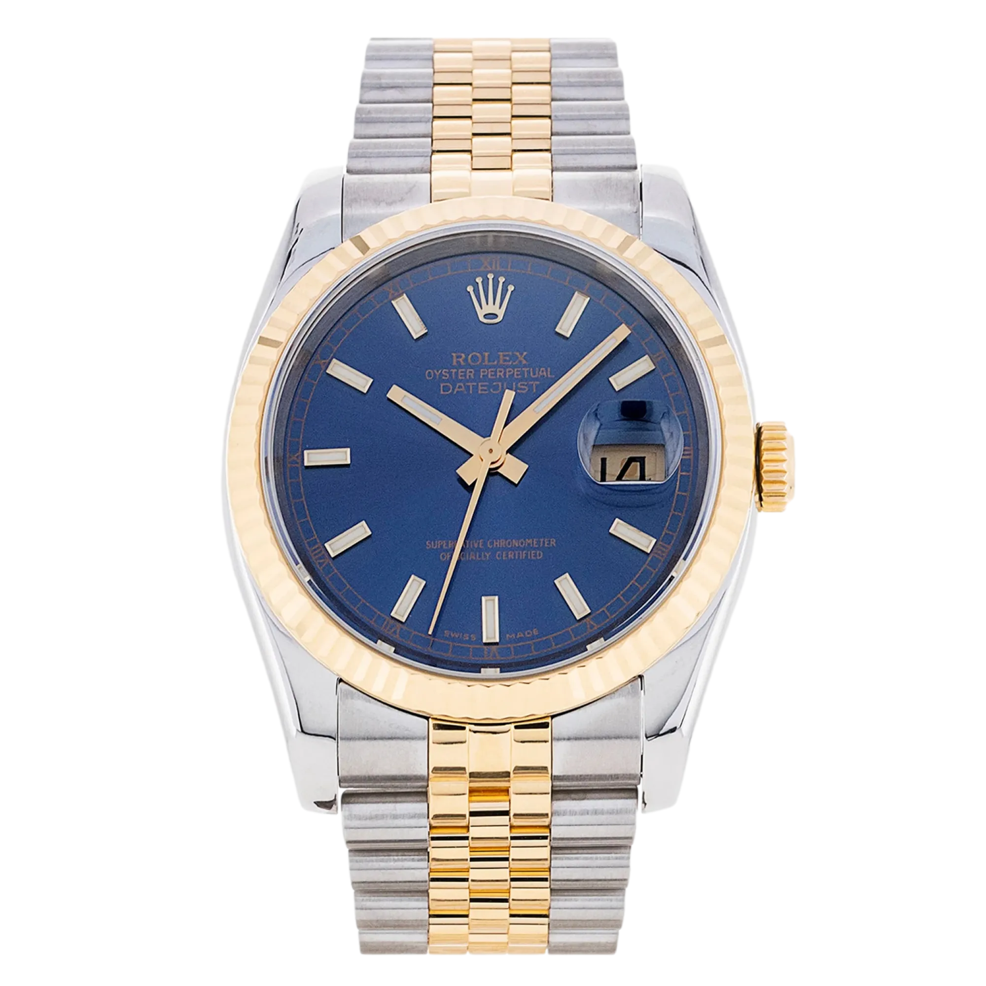 Rolex Datejust 116233 Uhrwerk: Automatik Gehäusegröße: 36 mm Gehäusematerial: Stahl und Gelbgold Armbandmaterial: Stahl und Gelbgold (Jubilee) Zifferblatt: Blau mit Stabindexen Wasserdichtigkeit: 100 Meter